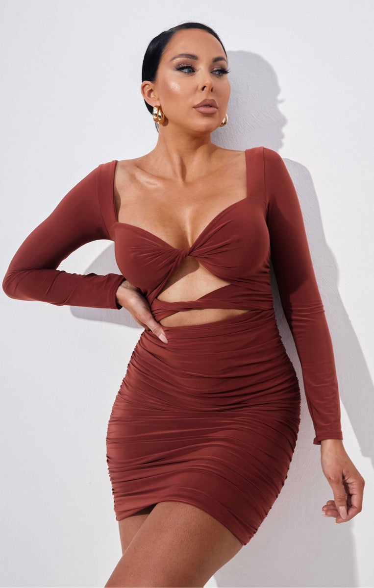 Be ready to have all eyes on you as soon as you step out in a ruched mini dress, an iconic piece for hitting up clubs and bars. After a year of kickin’ it back in our sweats at home (we aren’t complaining too much), most of us gals are more than ready for a dressy night out, so why not make a ruched mini dress your first choice? Our Rust Ruched Cut Out Front Mini Dress is the absolute night out dress of dreams. Giving us those Love Island feels, you’ll be everyone’s type on paper when you step out in this must-have ruched mini dress this summer.