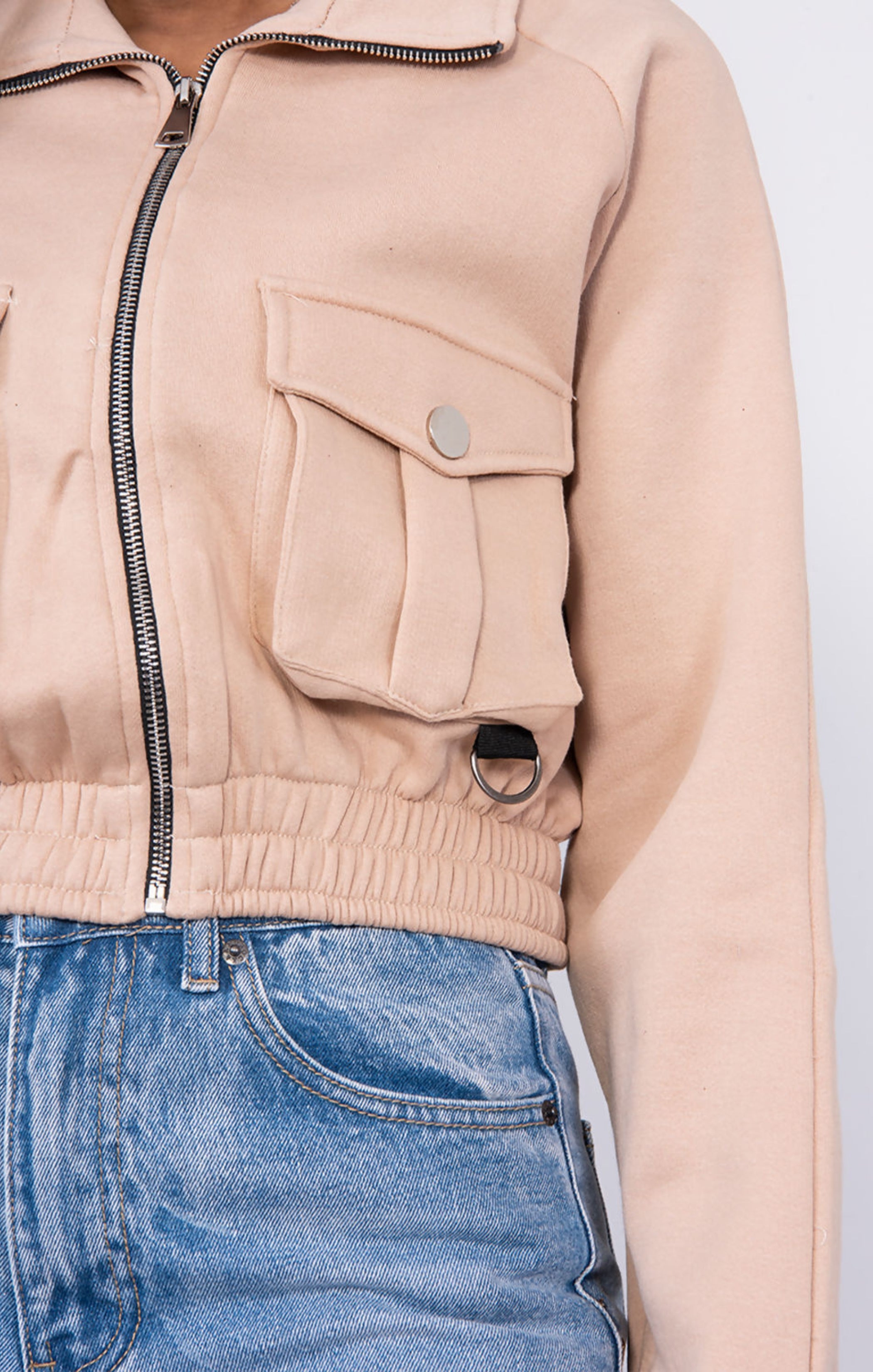 Beige Zip Up Long Sleeve Cargo Pocket Cropped Sweatshirt - Ayla