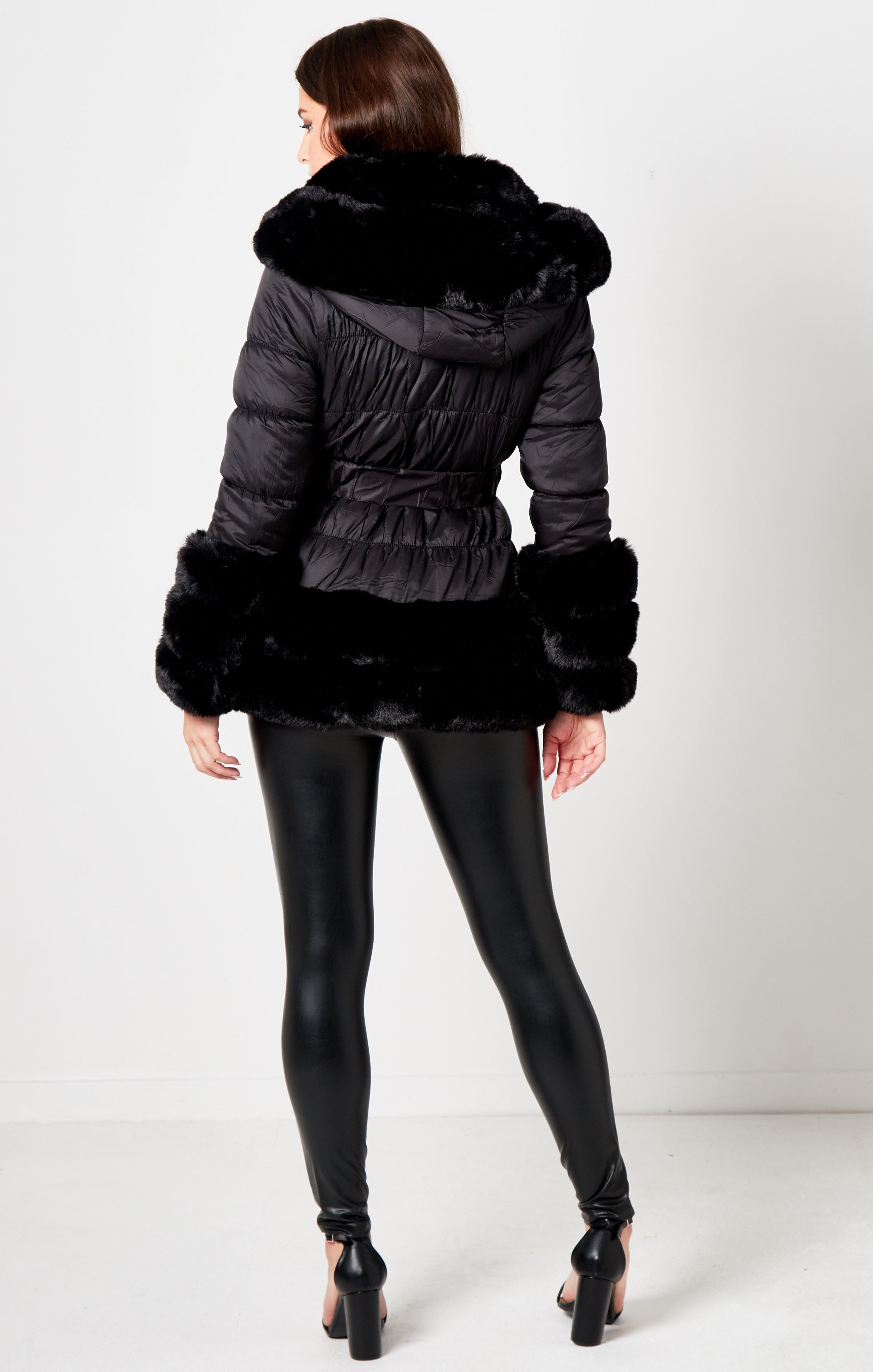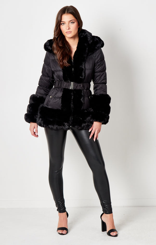 Black Belted Padded Faux Fur Detail Hooded Coat
