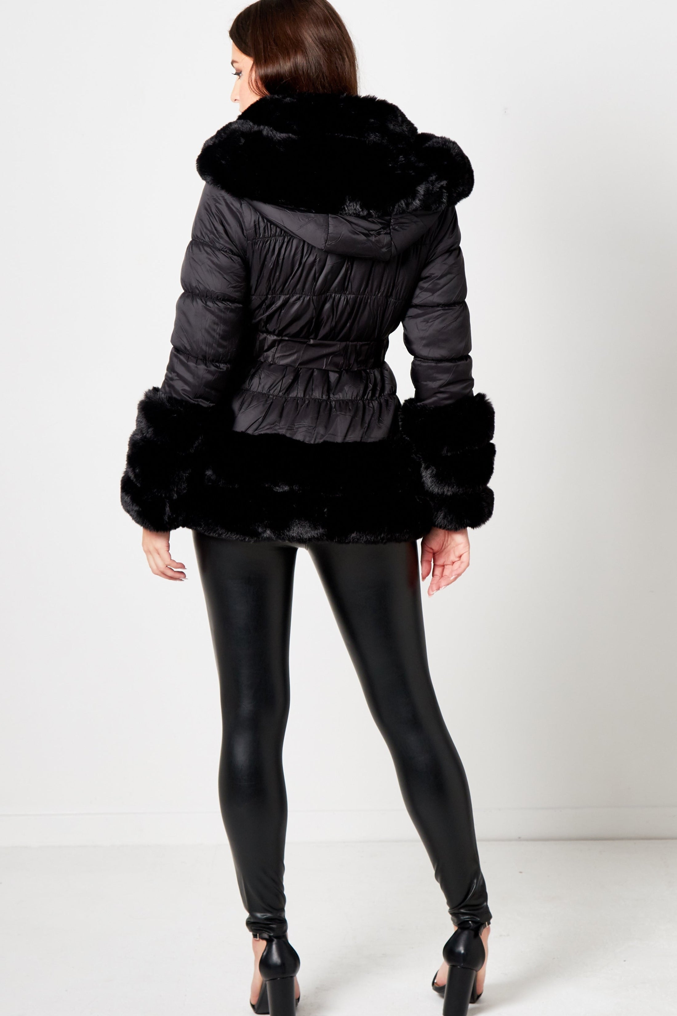 Black Belted Padded Faux Fur Detail Hooded Coat
