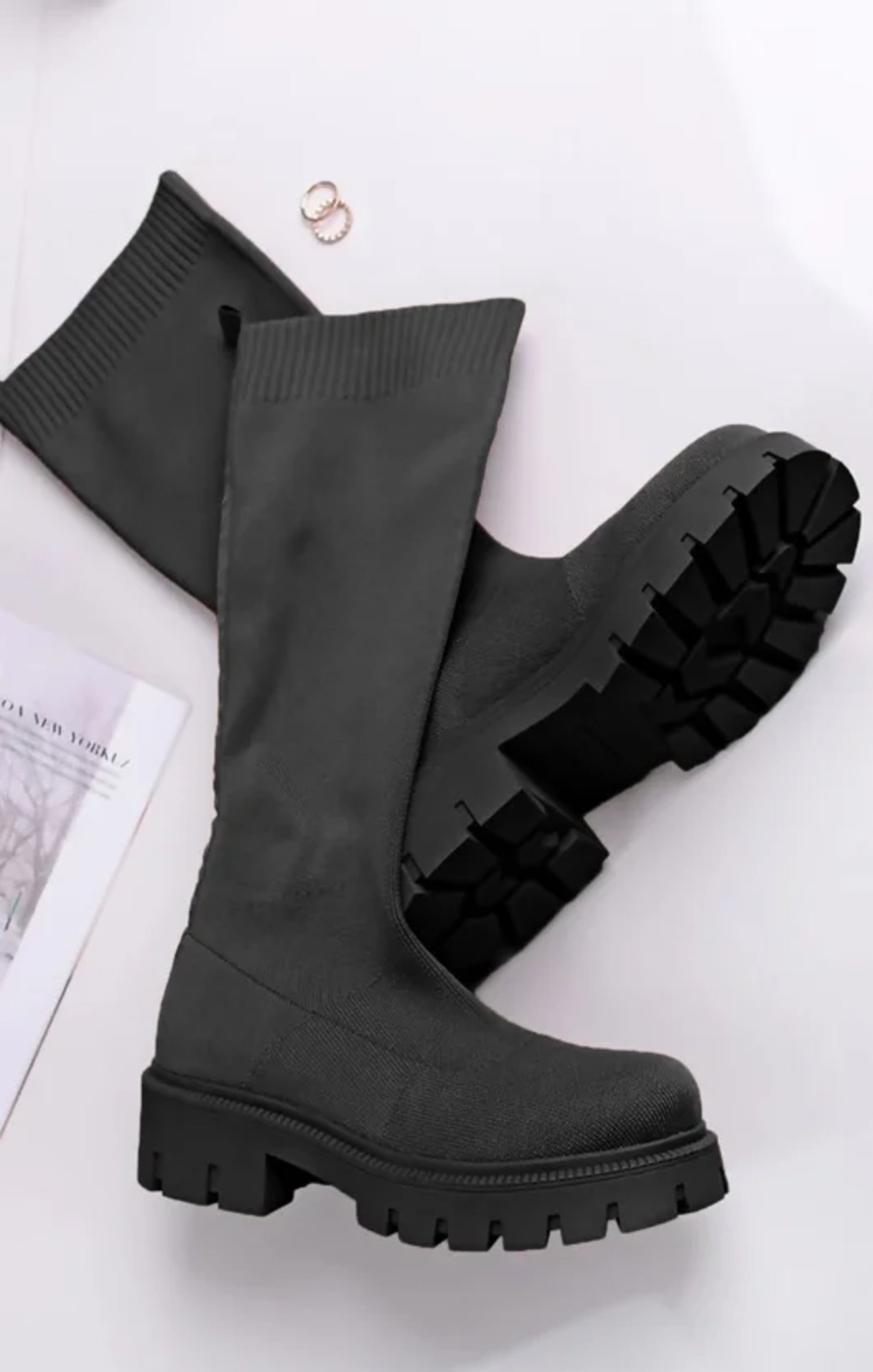 Black Chunky Platform Knee High Boots For the girls who like their style served bold and unapologetic, the Black Chunky Platform Knee High Boots are the ultimate power move. With their sock fit silhouette and ultra chunky sole, these boots blend comfort with attitude in a way that feels totally now. Whether you're heading out for cocktails or elevating your everyday edit, this pair brings that off duty model edge. Pull them on with a knit dress or oversized blazer for maximum impact.