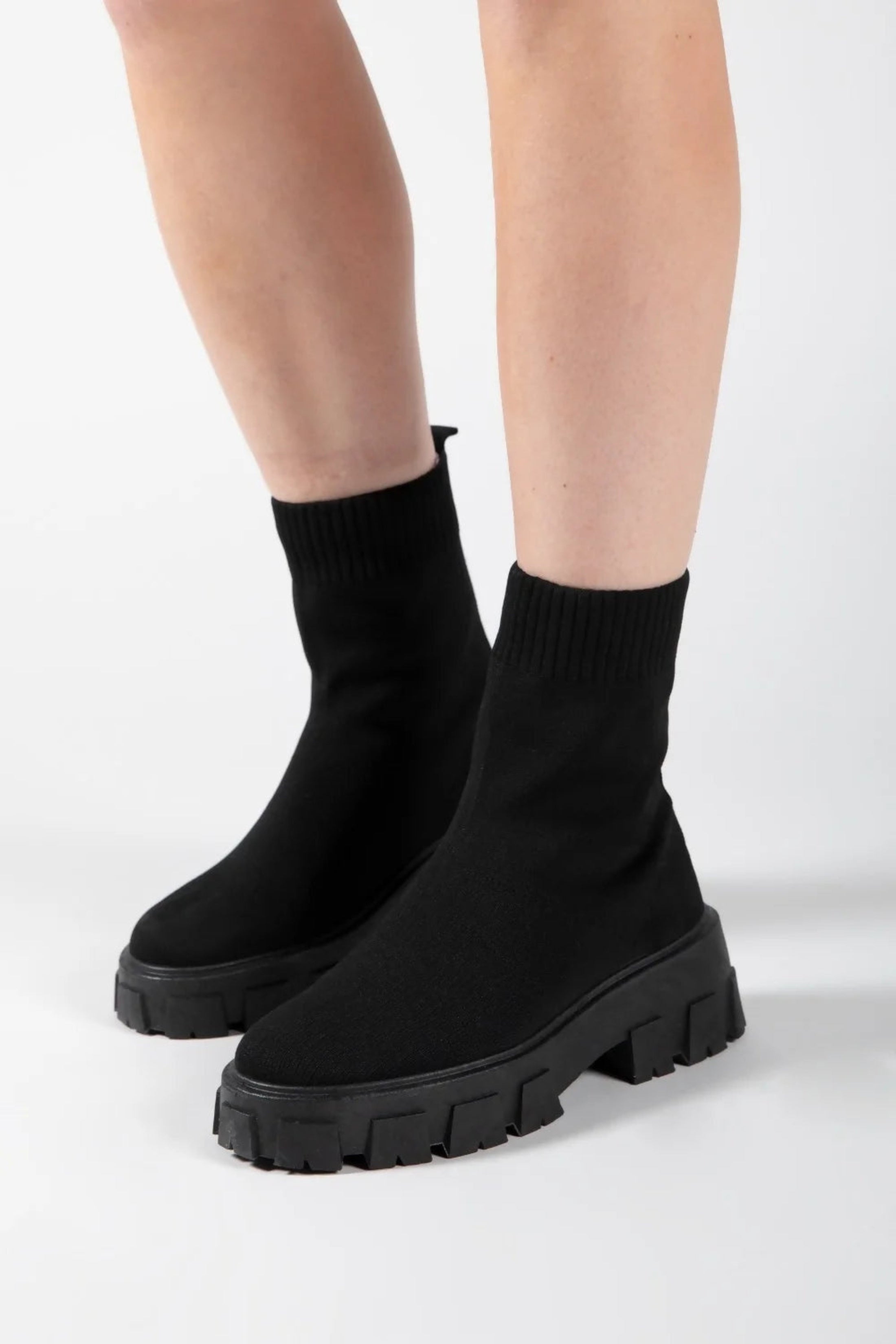 Black Cleated Pull On Knit Chunky Sole Sock Ankle Boots