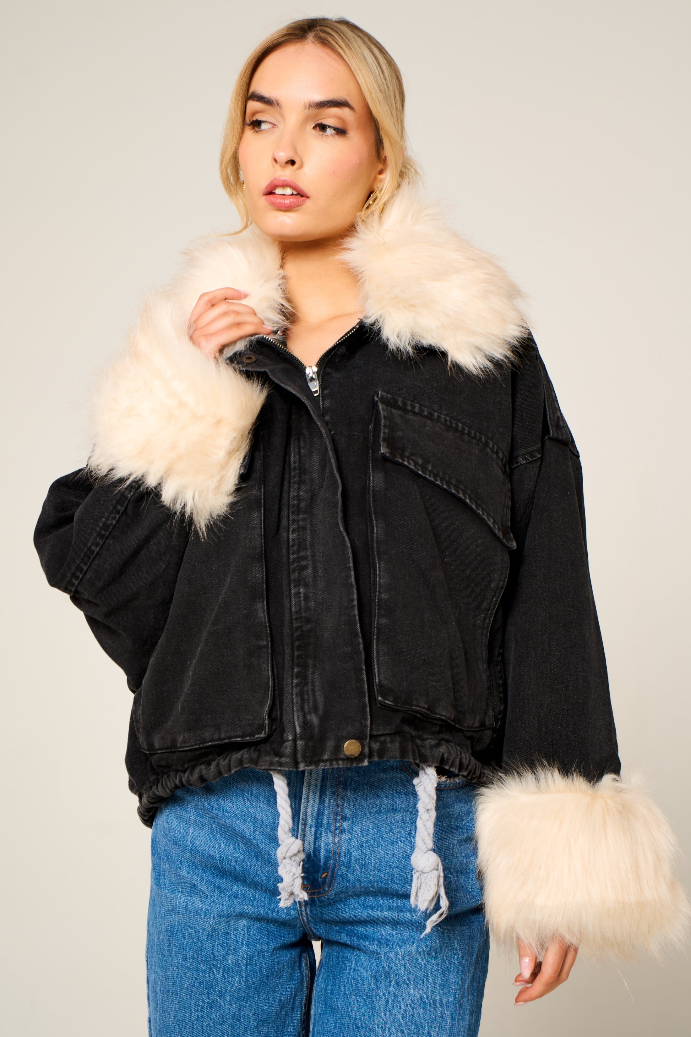 Black Denim Cream Faux Fur Fluffy Oversized Jacket
