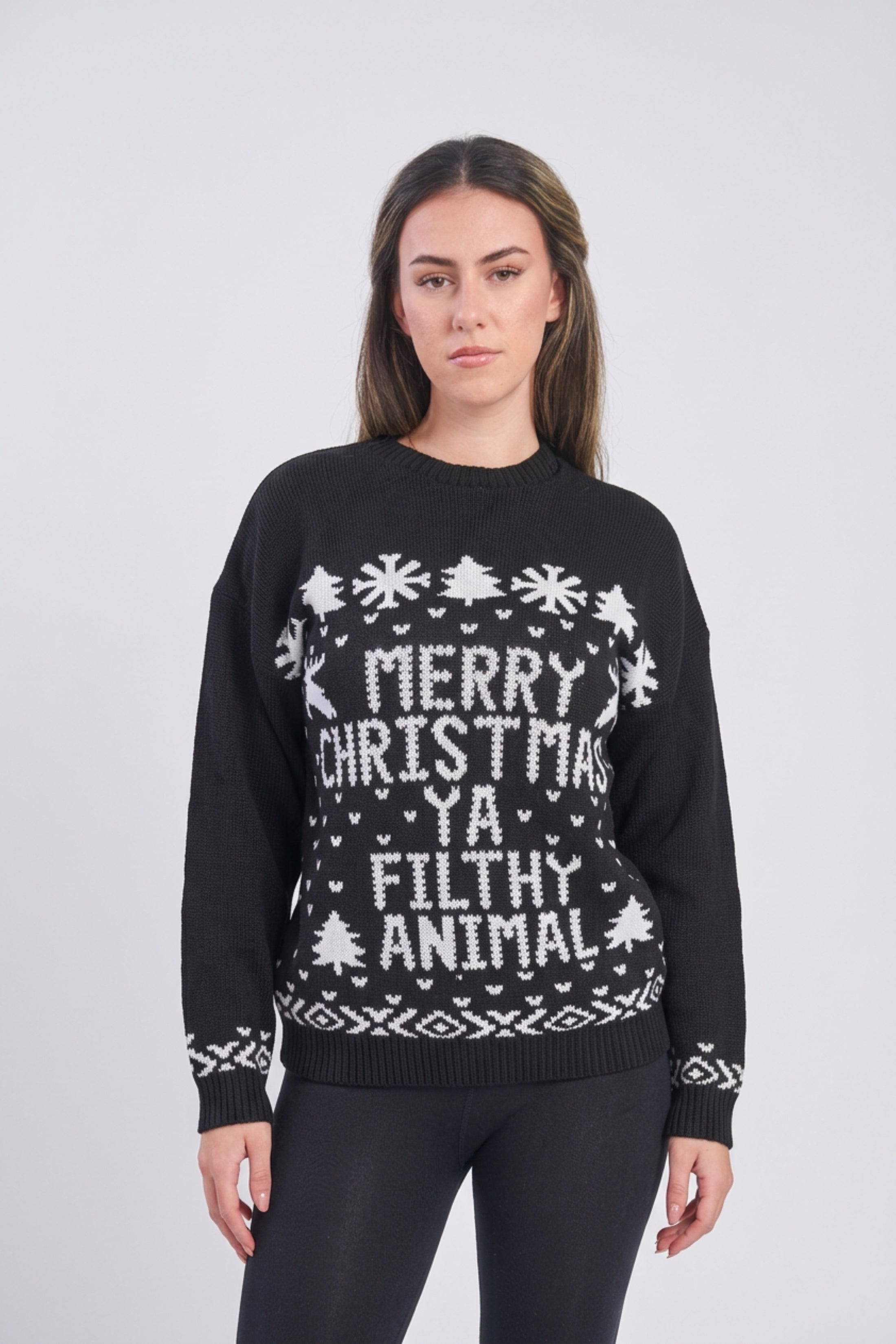 Get festive and turn heads this season with the bold and playful Black Merry Christmas Ya Filthy Animal Jumper . Crafted from a cozy knit fabric, this Christmas jumper features a striking black base adorned with festive white patterns and the iconic slogan from your favorite holiday classic. Perfect for spreading cheer at Christmas parties or lounging by the fire, this jumper is both fun and stylish. Team it with leggings and ankle boots for a cozy-chic winter look.