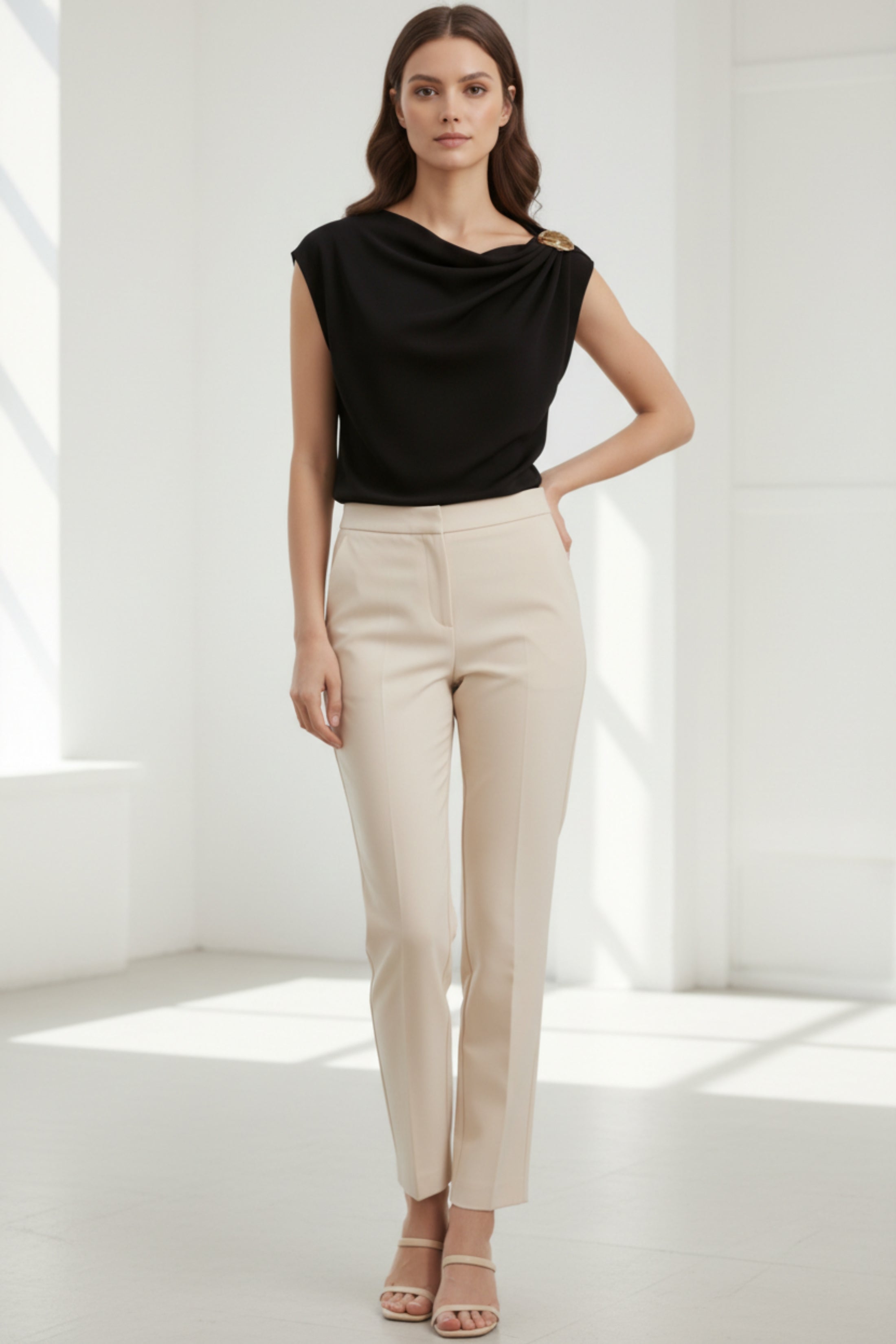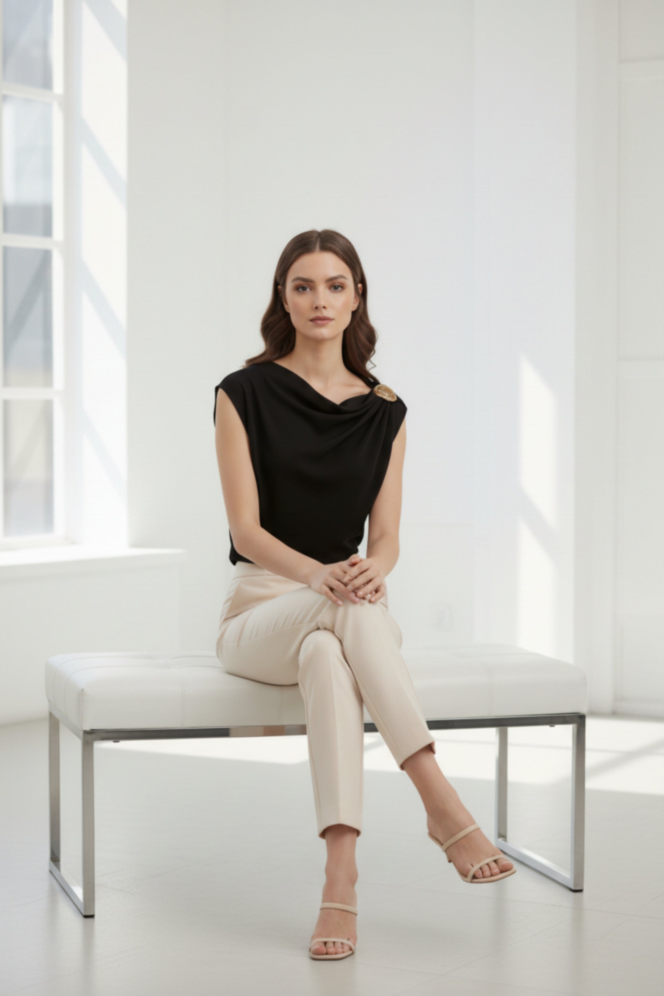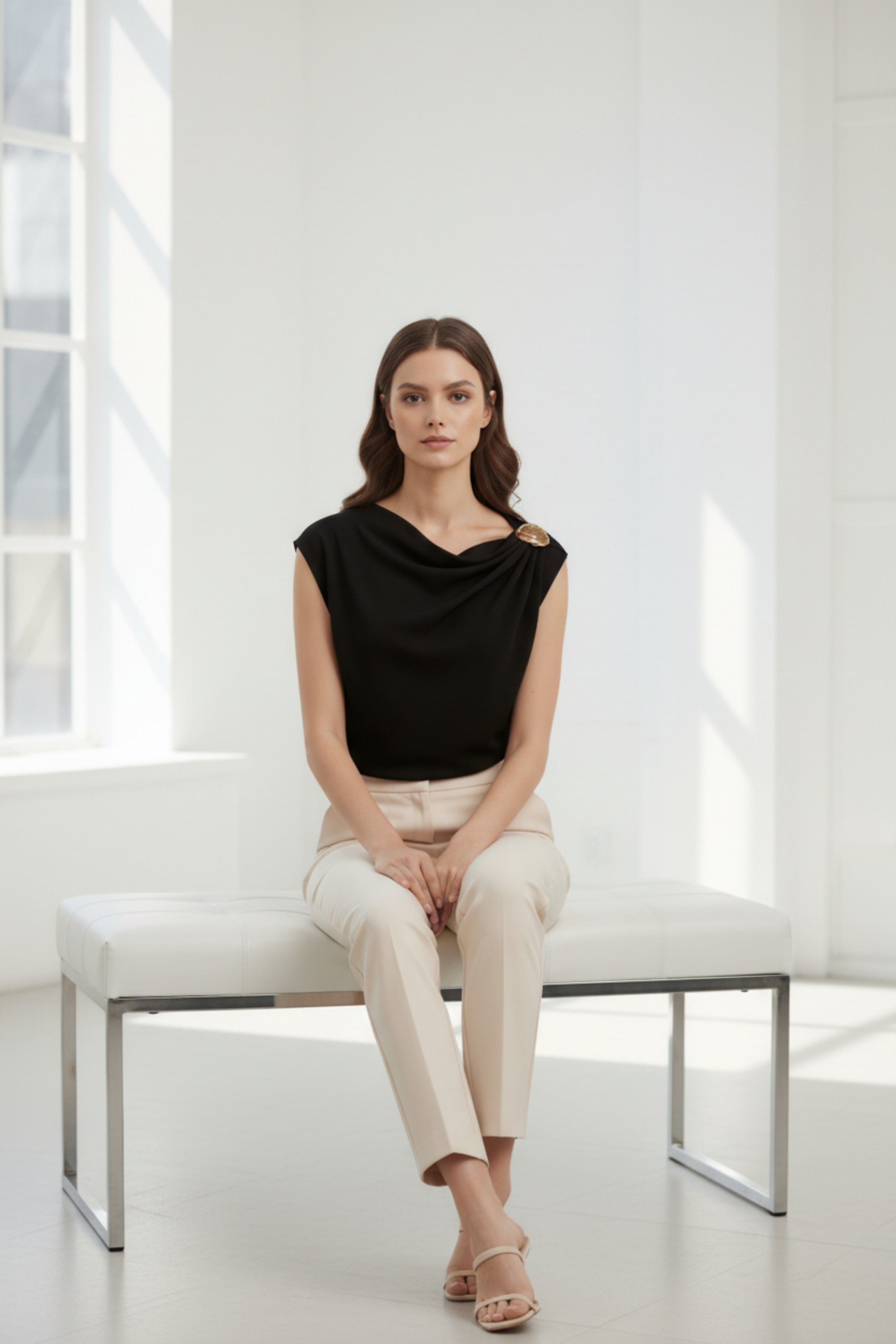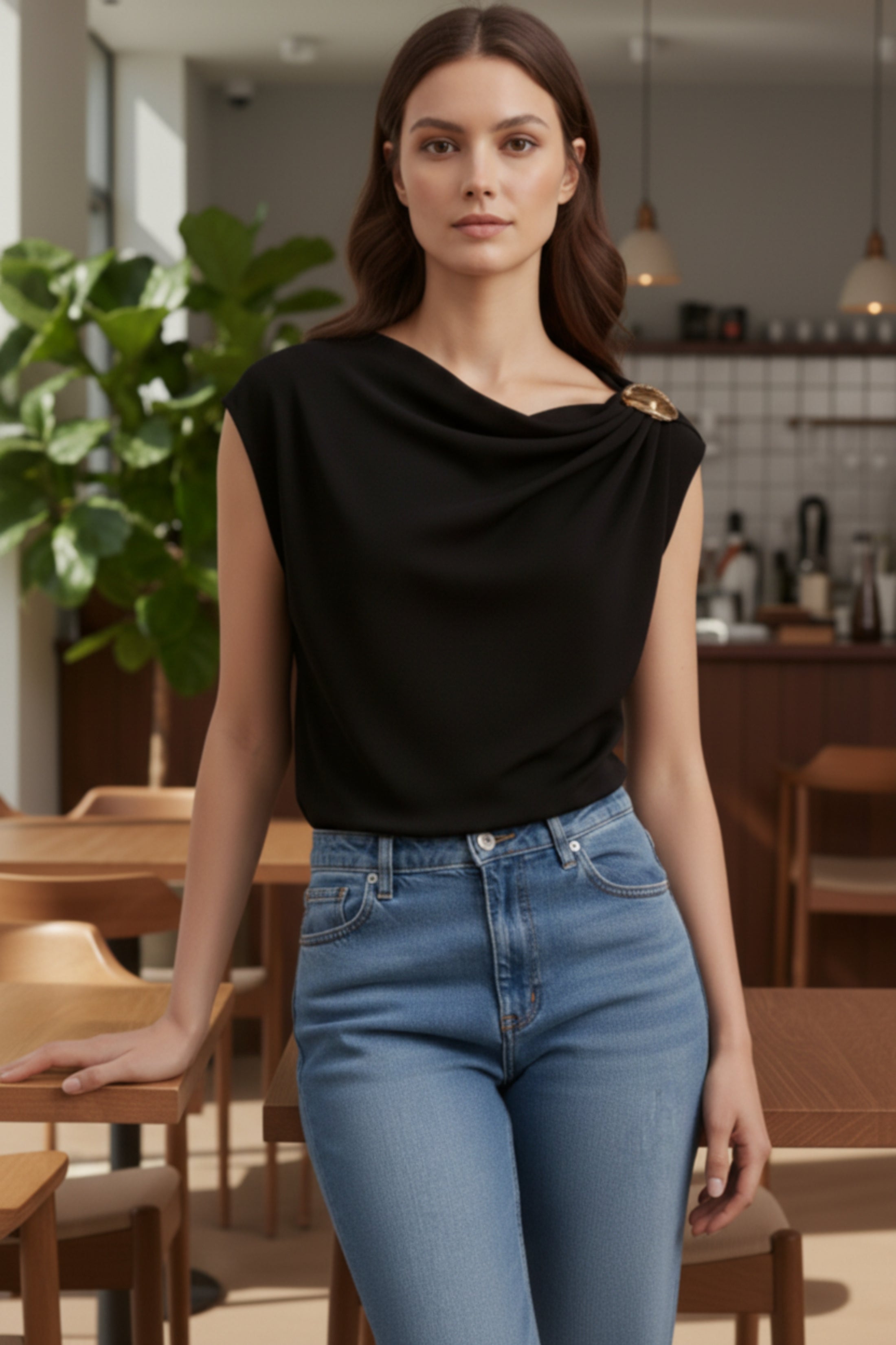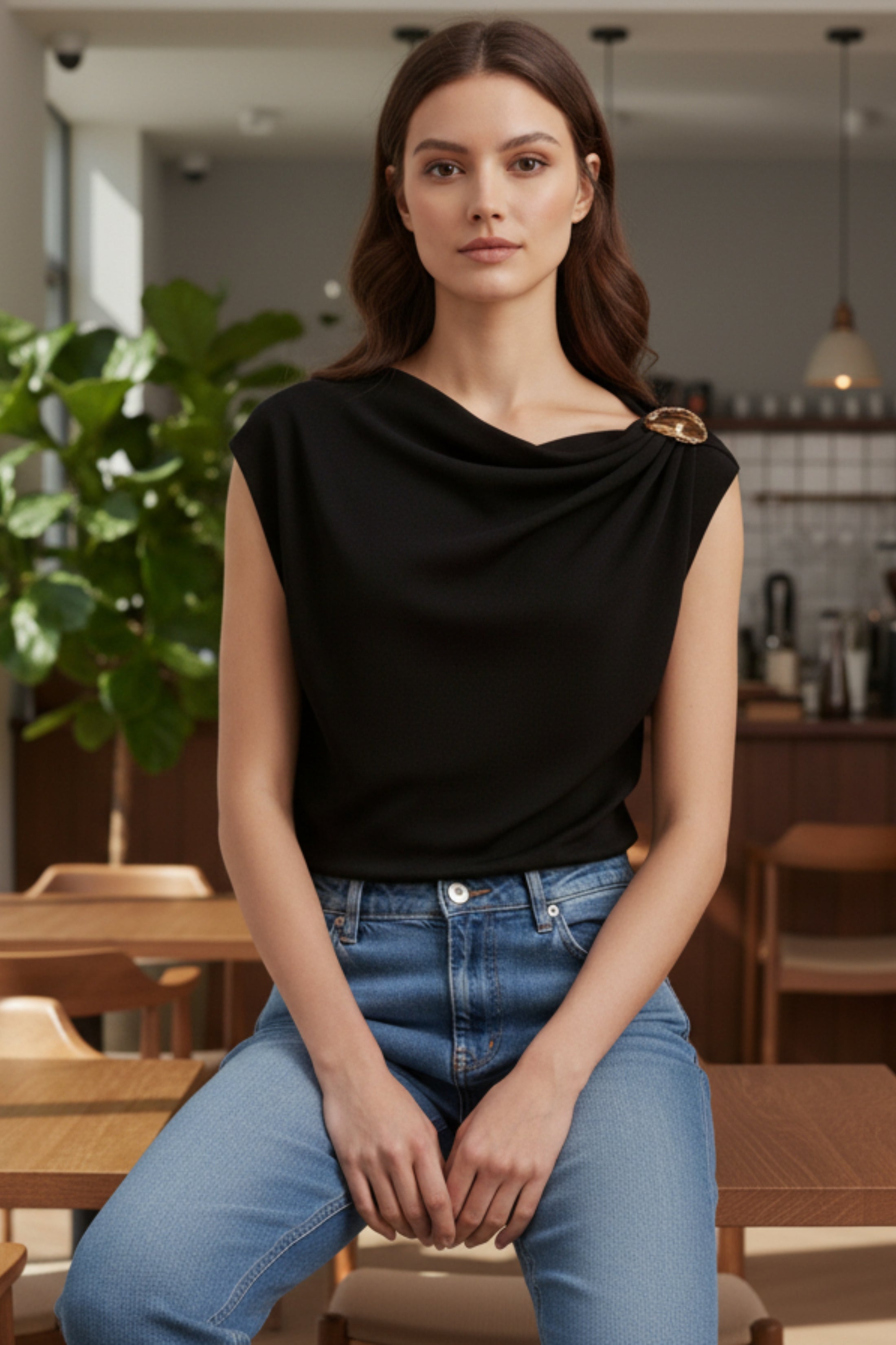 Upgrade your essentials with this chic black one shoulder top, featuring an elegant draped neckline and a standout gold shoulder accessory. Designed to flatter and elevate any look, this versatile piece can be styled with jeans for a laid-back finish or dressed up with tailored trousers and heels for evenings out. A timeless wardrobe staple with a luxe touch.