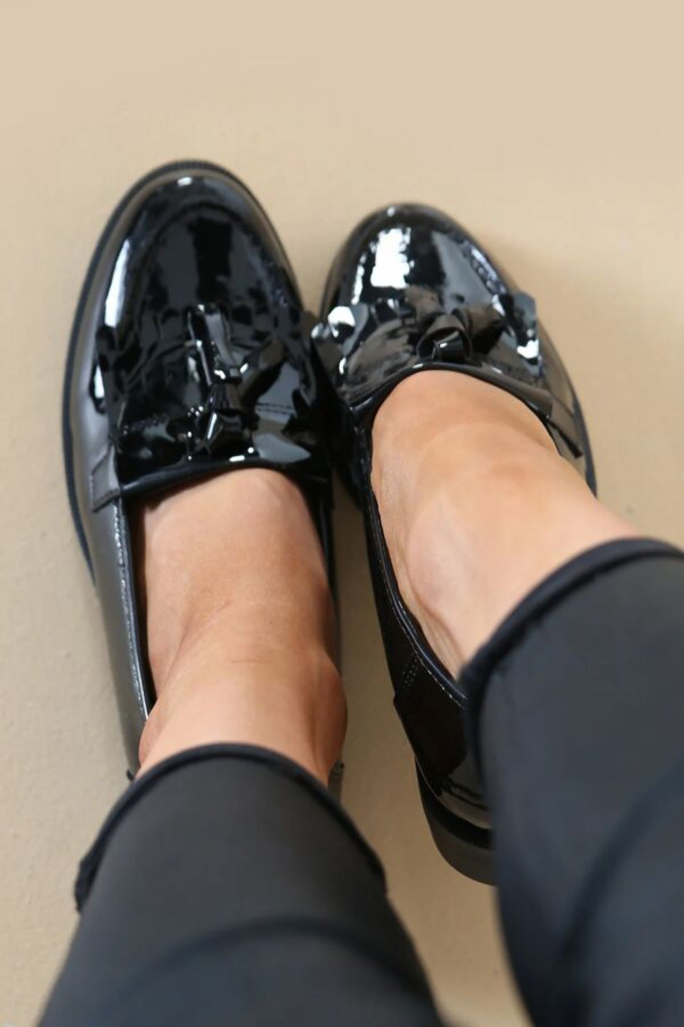 Black Patent Slip On Flat form Loafer Shoes With Tassel - Elysia