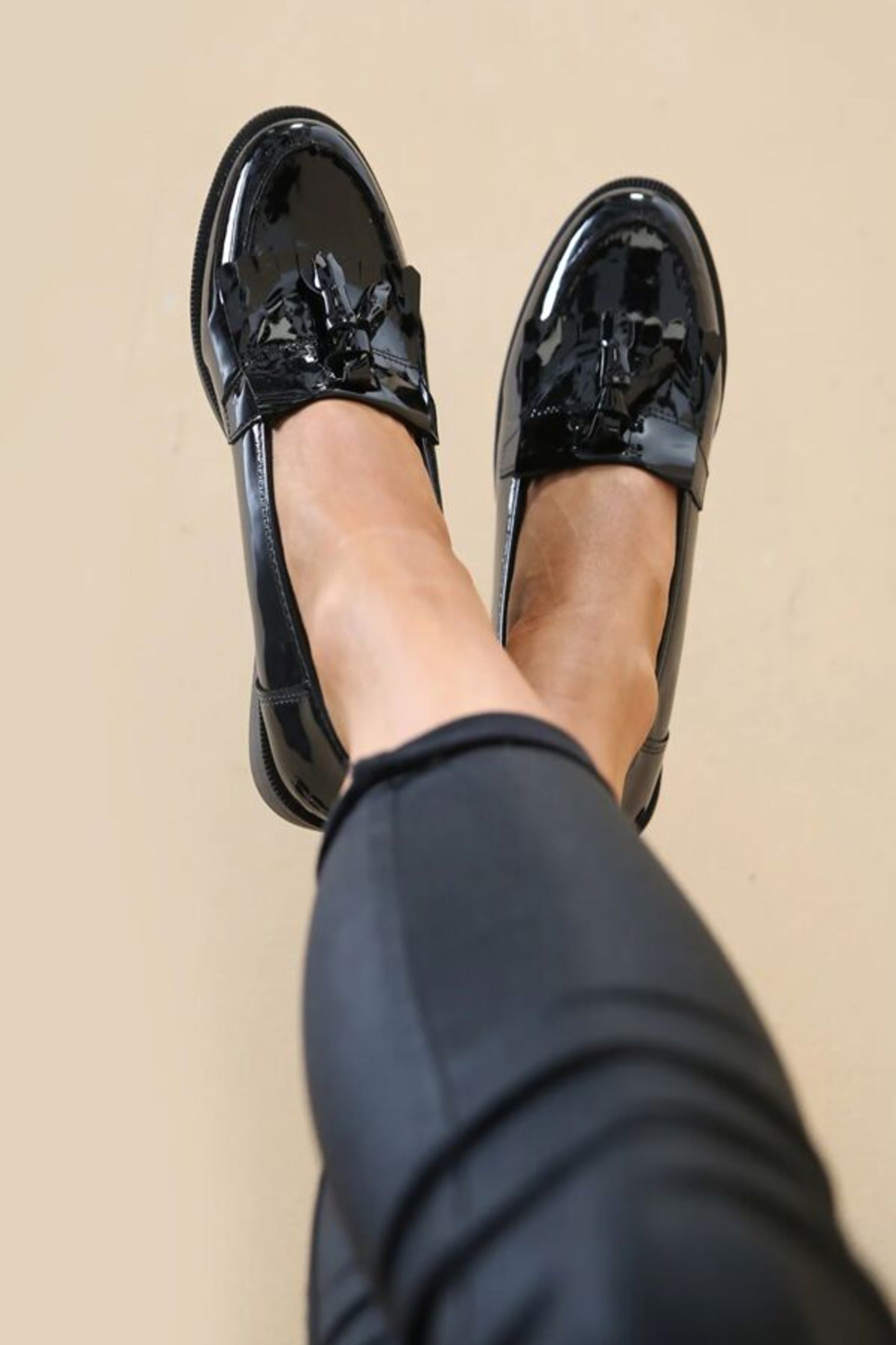 Black Patent Slip On Flat form Loafer Shoes With Tassel For a polished yet effortless style, step into the Black Patent Slip On Flat form Loafers With Tassel . Designed to exude classic elegance with a modern twist, these loafers feature a sleek patent finish and a statement tassel detail, making them a must have for your smart casual wardrobe. With their comfortable flat form sole, they offer a perfect blend of sophistication and everyday wearability. Pair them with tailored trousers for a chic office look or style them with denim for a relaxed yet refined vibe.