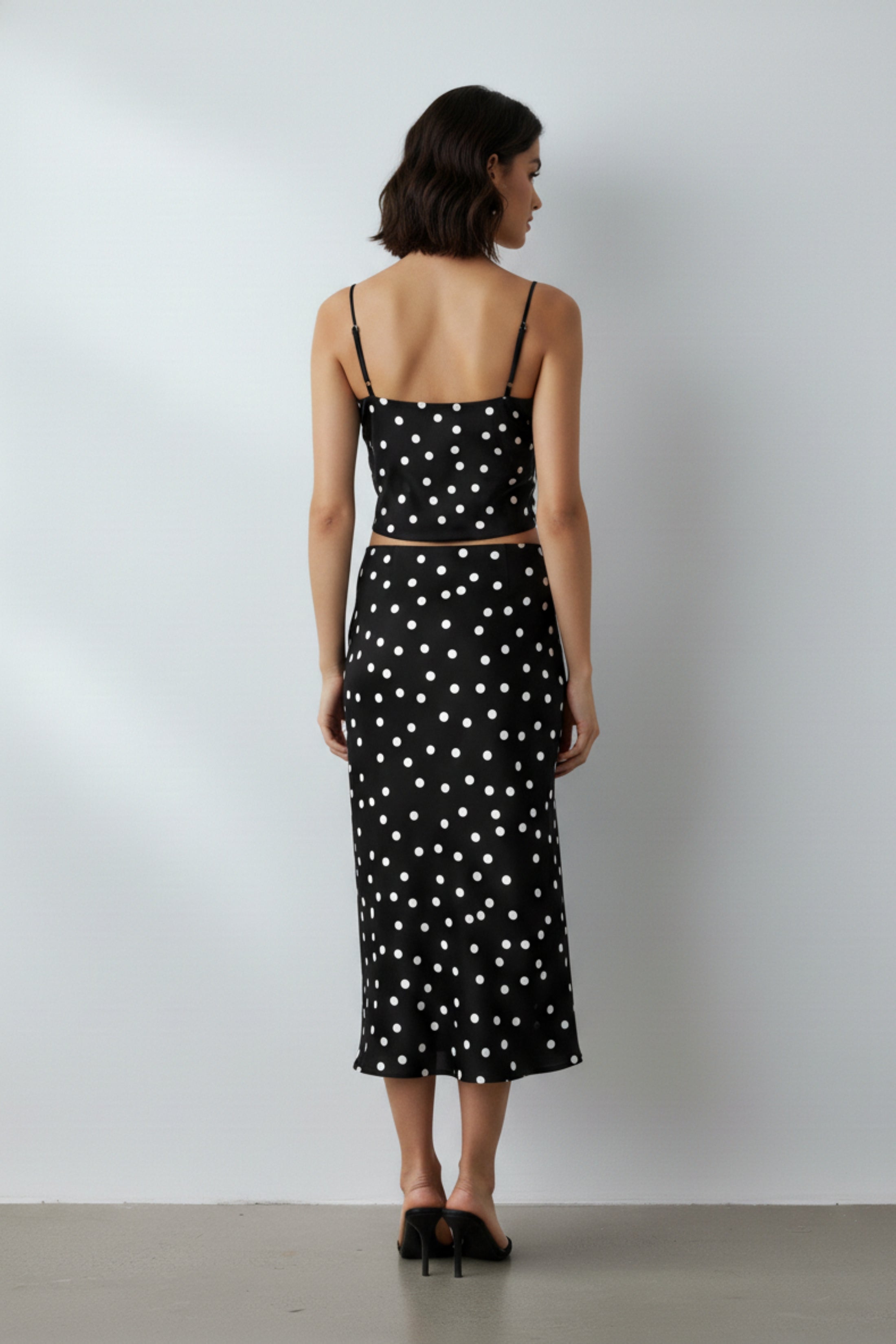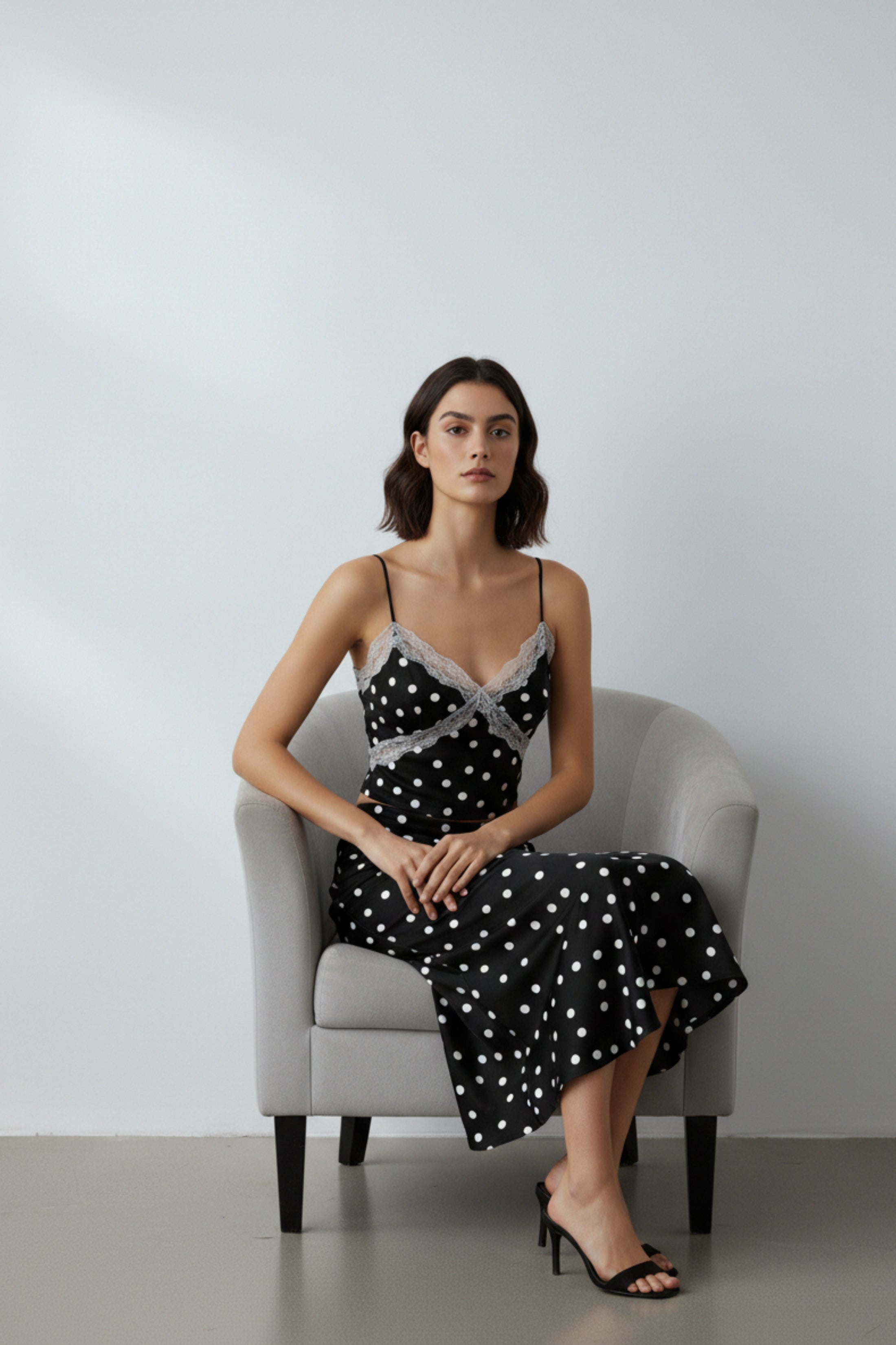 Black Polka Dot Satin Lace Trim Cami Crop Top & Midaxi Skirt Co-Ord- Niyana
