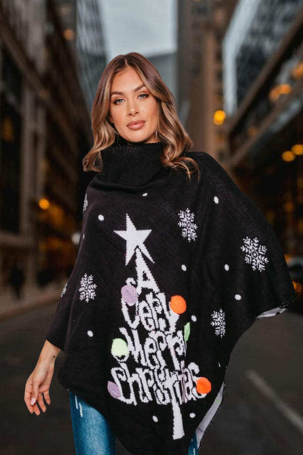 Black Pom Pom Merry Christmas knitted Poncho - Aviva