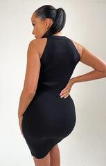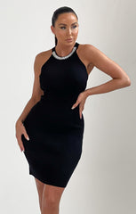 Black Ribbed Diamante High Neck Bodycon Dress - Laura