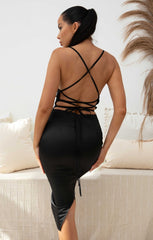 Black Satin Strappy Tie Detail Bodycon Midi Dress
