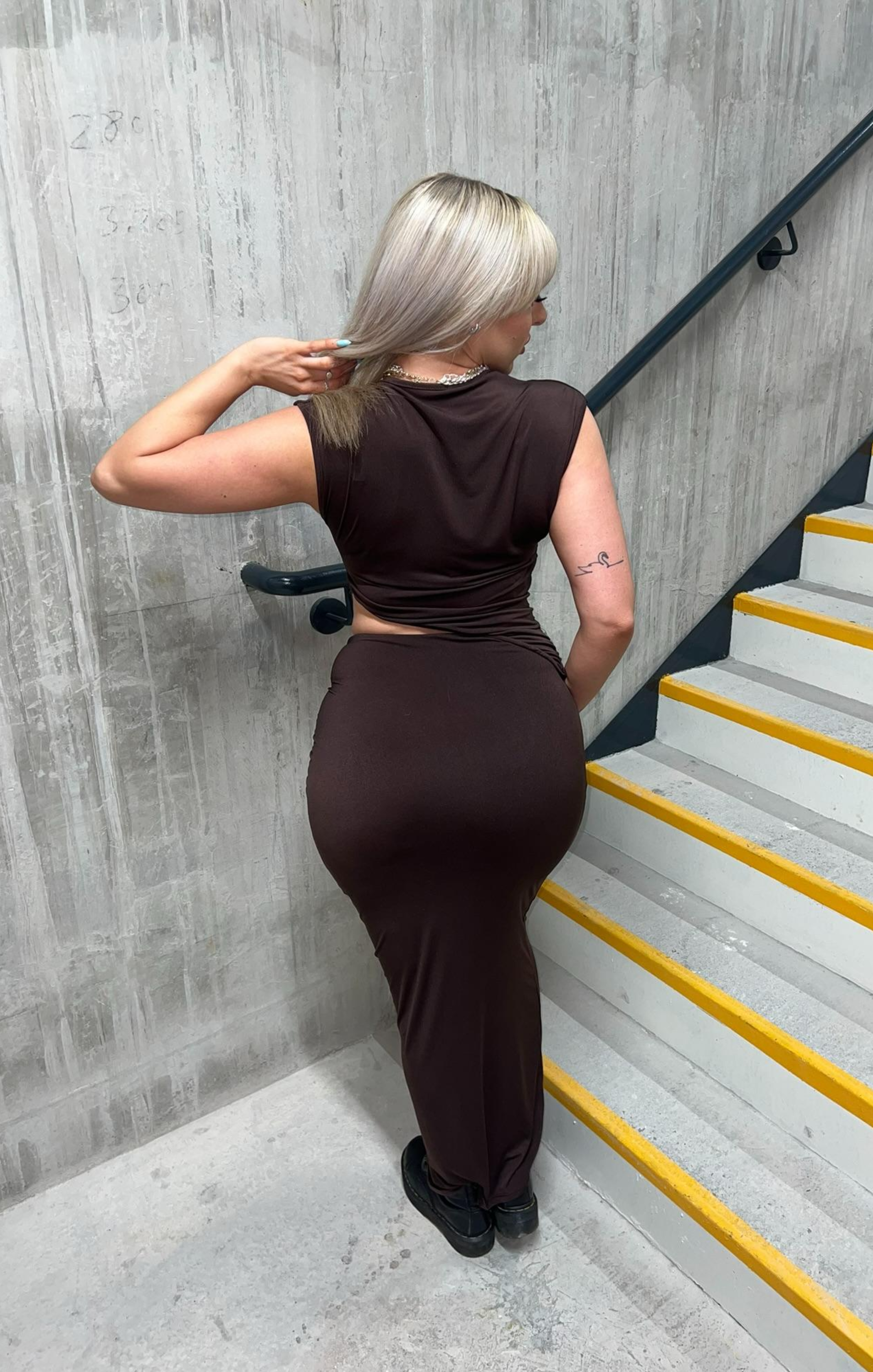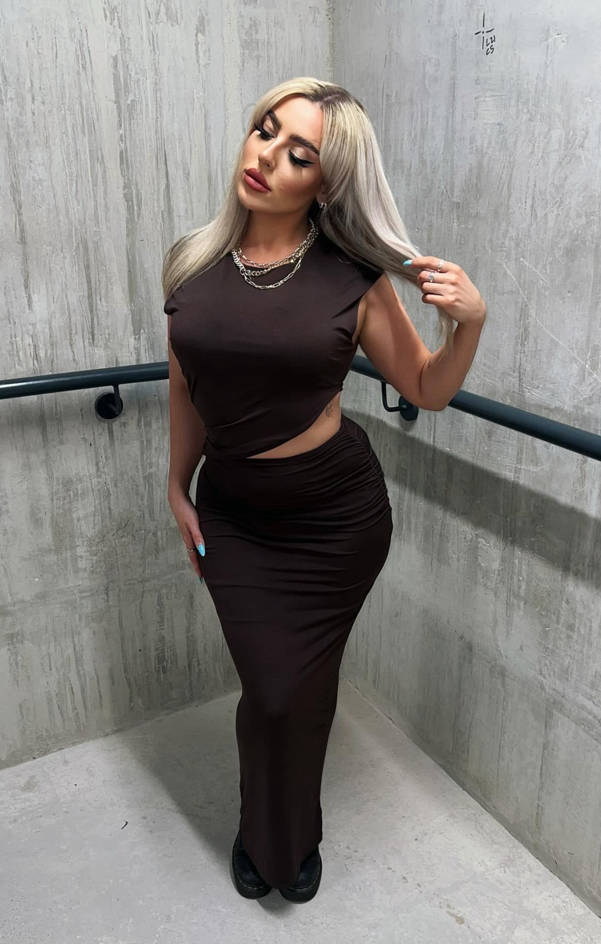 Turn heads in the effortlessly chic Brown Sleeveless Cut Out Midi Dress . Designed to accentuate your curves, this figure hugging midi dress features a sleek asymmetric cut out detail that adds just the right amount of edge. The sleeveless design and soft, stretch fabric ensure all day comfort while keeping your look elevated and modern. Perfect for date nights, cocktail parties, or any occasion where you want to make a statement. Style with strappy heels and minimal accessories for a sleek, sophisticated finish.