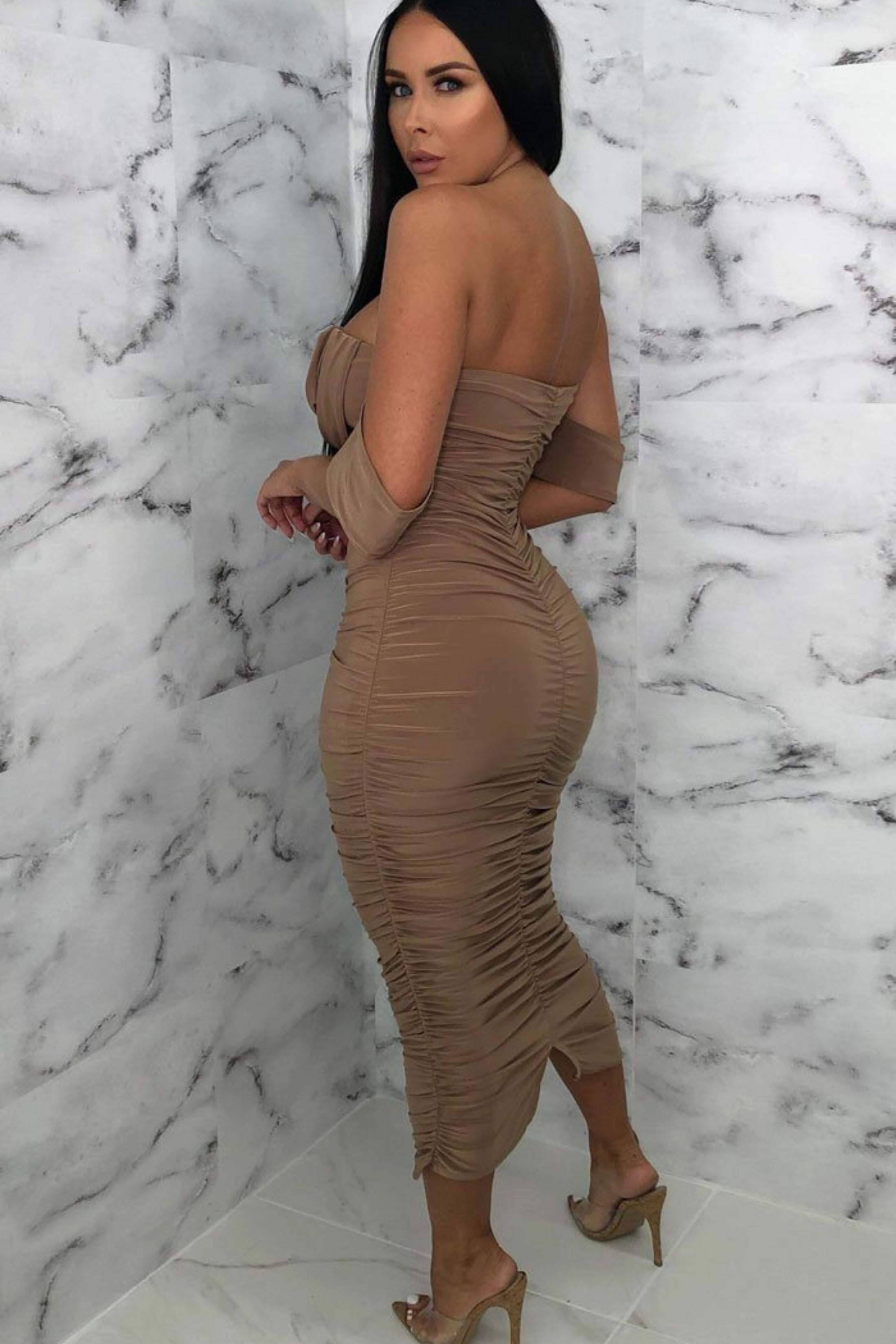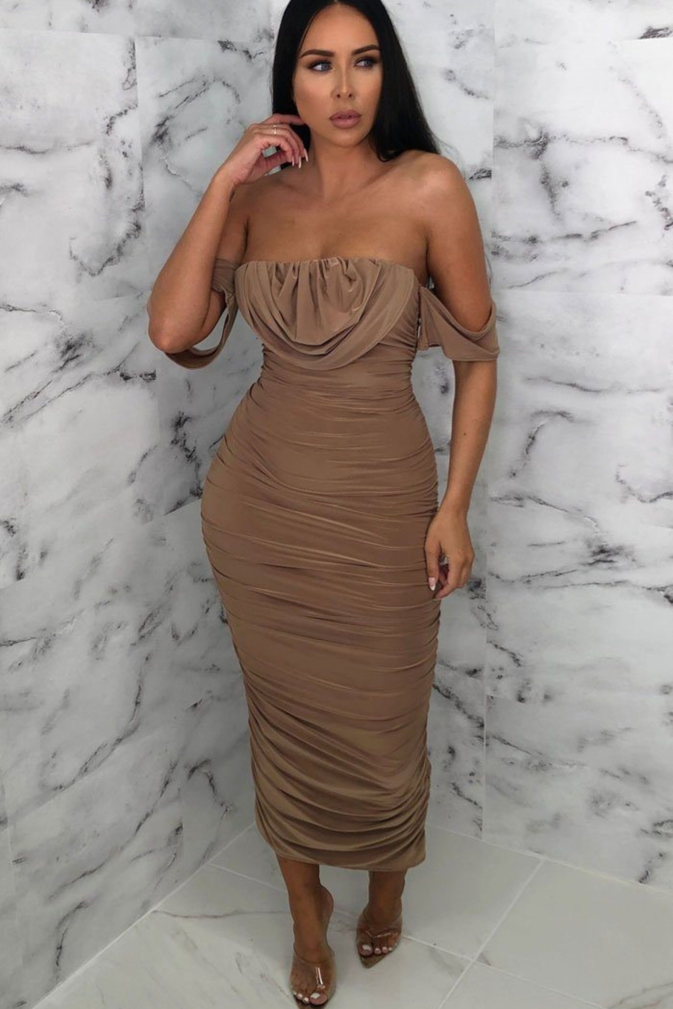 Camel Bardot Cowl Neck Ruched Midi Dress Keep it classy in our Camel Bardot Cowl Neck Ruched Midi Dress . This must have cowl neck and gorj ruched design is to die for. The elegant bardot neck and midi length are perf for you next classy night out.