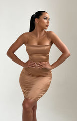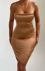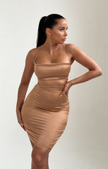 Camel Satin Lace Up Back Strappy Bodycon Mini Dress - Clary