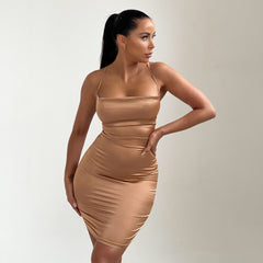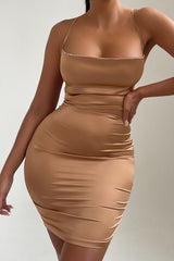 Camel Satin Lace Up Back Strappy Bodycon Mini Dress