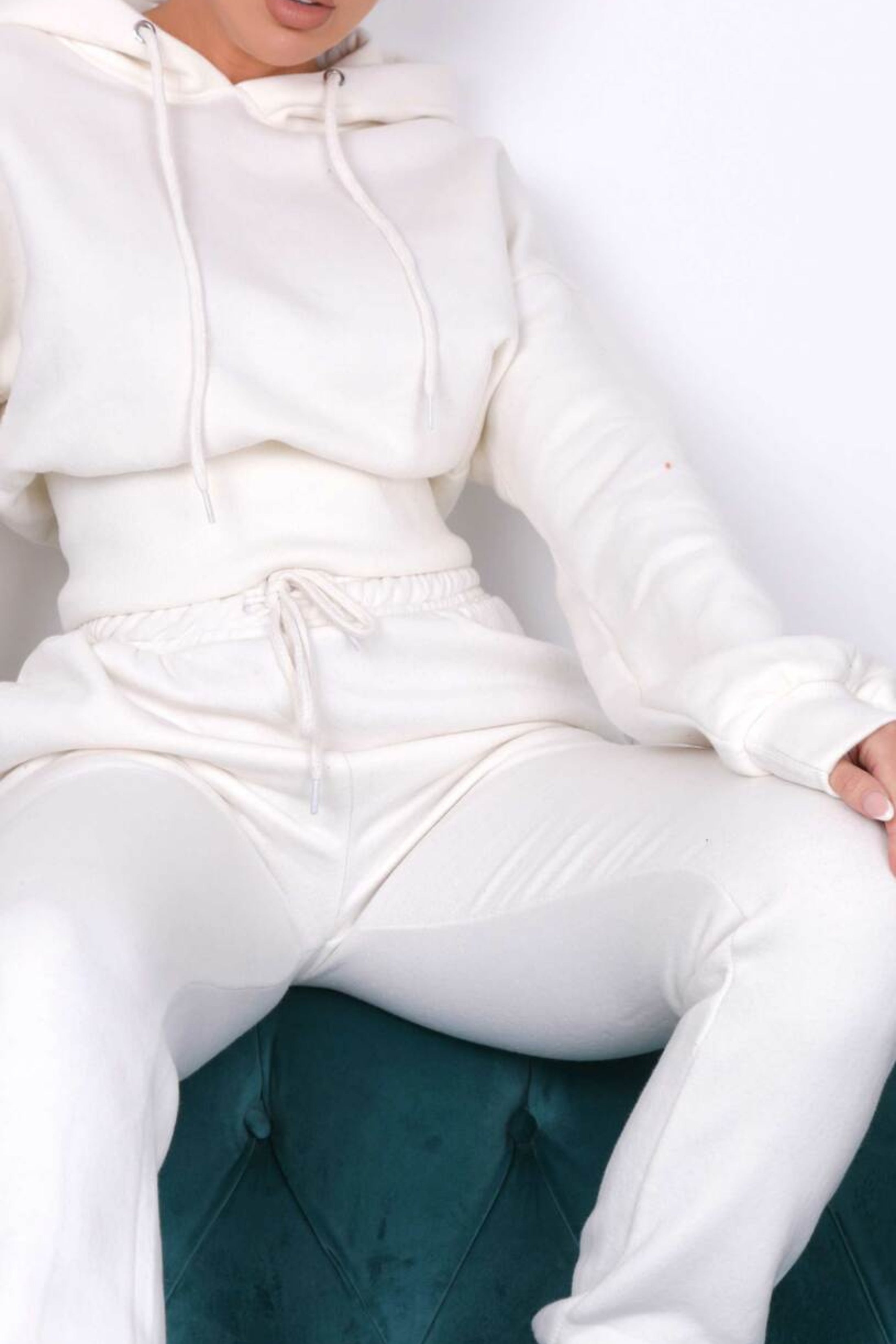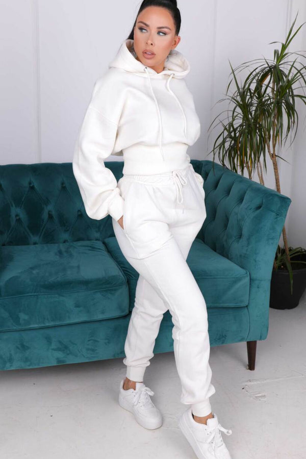 Cream Long Sleeve Cropped Fleece Hoodie & Cuffed Joggers Loungewear Set - Layla