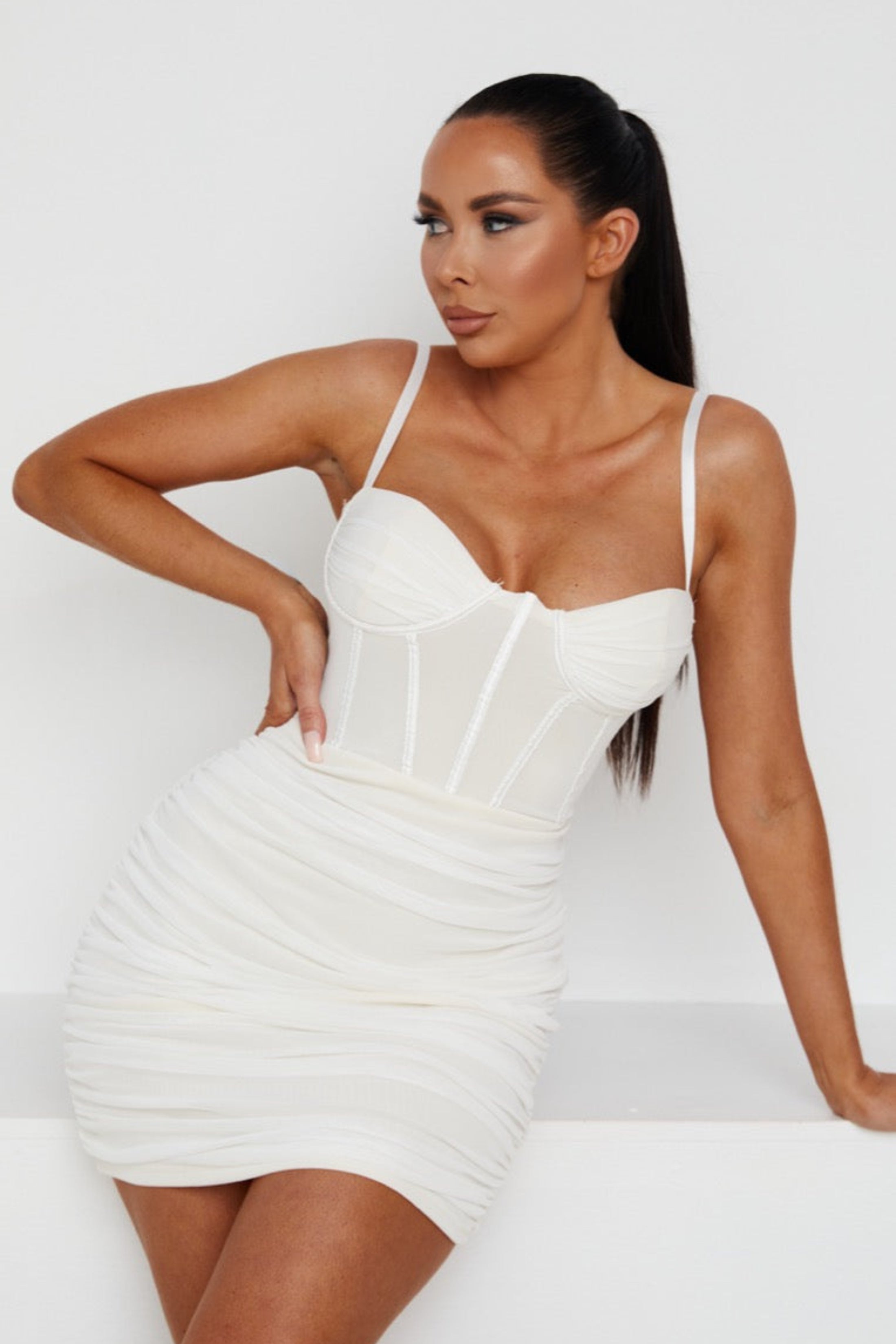 Channel skin baring silhouettes this season with our Cream Mesh Ruched Corset Strappy Bodycon Mini Dress .Featuring a ruched design, a corset-inspired front and spaghetti straps - complete in a stunning mesh material, a bodycon fit and a mini length. The only problem? Choosing just one colour. Team with barely there heels and sleek locks for a look that will turn heads.