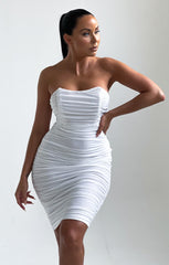Cream Ruched Mesh Bandeau Bodycon Midi Dress - Eda
