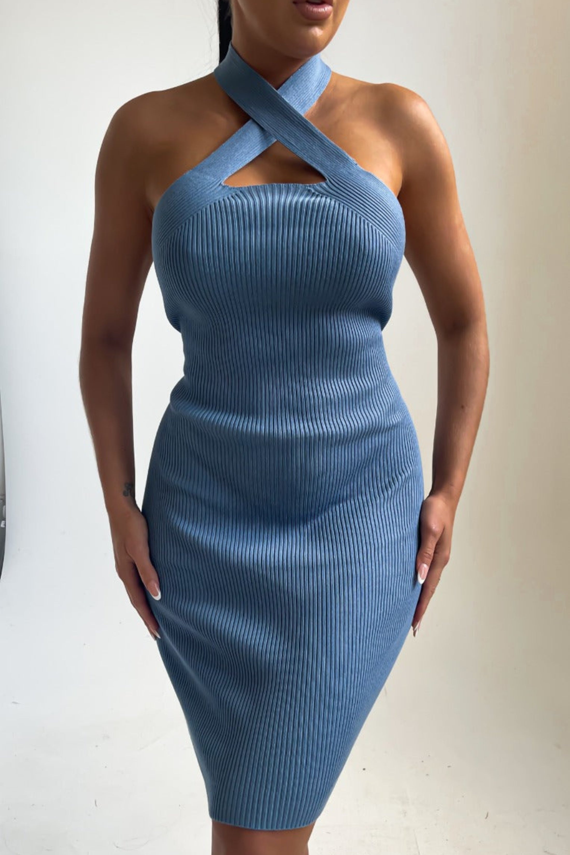 Dusky Blue Knitted Cut Out Crossover Halter Neck Bodycon Mini Dress - Elena