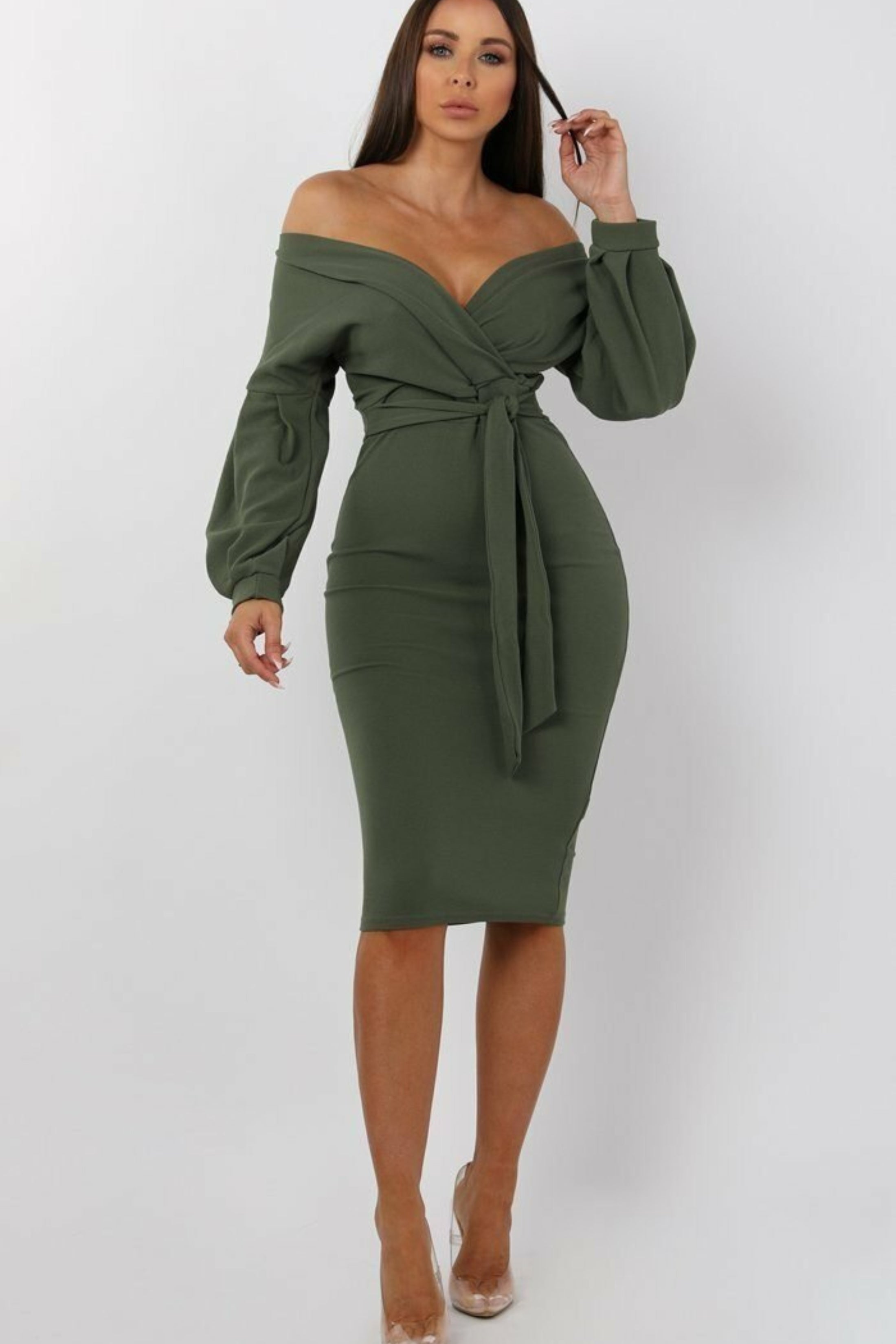 Khaki Belted Bodycon Midi Dress Keep your summer look beyond classy in this luxe Khaki belted bodycon midi dress. With the bright colouring, body hugging fit and wrap front design along with the addition of belted detailing and the elegant midi length, this affordable bodycon dress is a simple must have in your summer wardrobe. Whether you are off for that date night dinner or off to your next big meeting, this sophisticated midi dress is sure to see you through the season with ease. Team this affordable Khaki dress up with some clear Perspex heels for that classic look like no other.