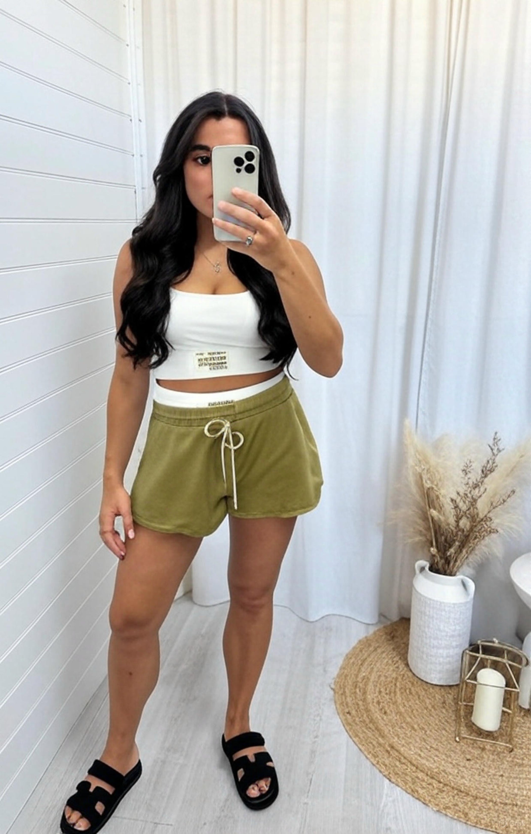 For a sporty yet chic look that exudes confidence, choose the stylish Khaki Sports Bralette and Shorts Co-Ord Set . Blending modern athleisure with a touch of elegance, this set is a must have for active days or casual outings. Featuring a supportive bralette and matching shorts with a comfortable drawstring waist, it’s designed to highlight your figure while keeping you on the move. Pair with black sandals for a sleek finish, or layer with a lightweight jacket for added flair.