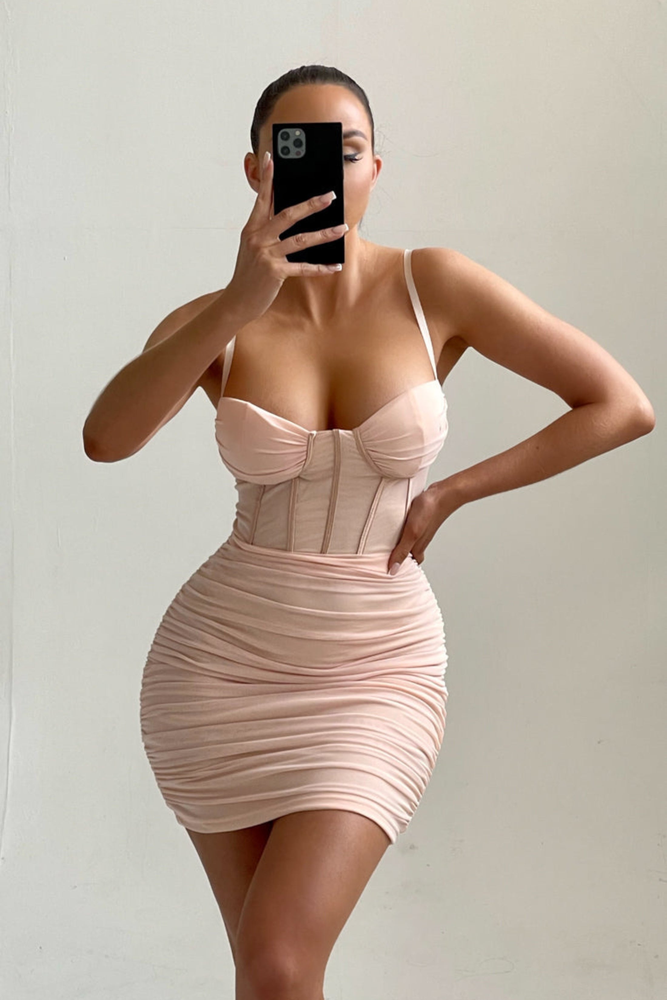 Nude Mesh Ruched Corset Strappy Bodycon Mini Dress - Penny