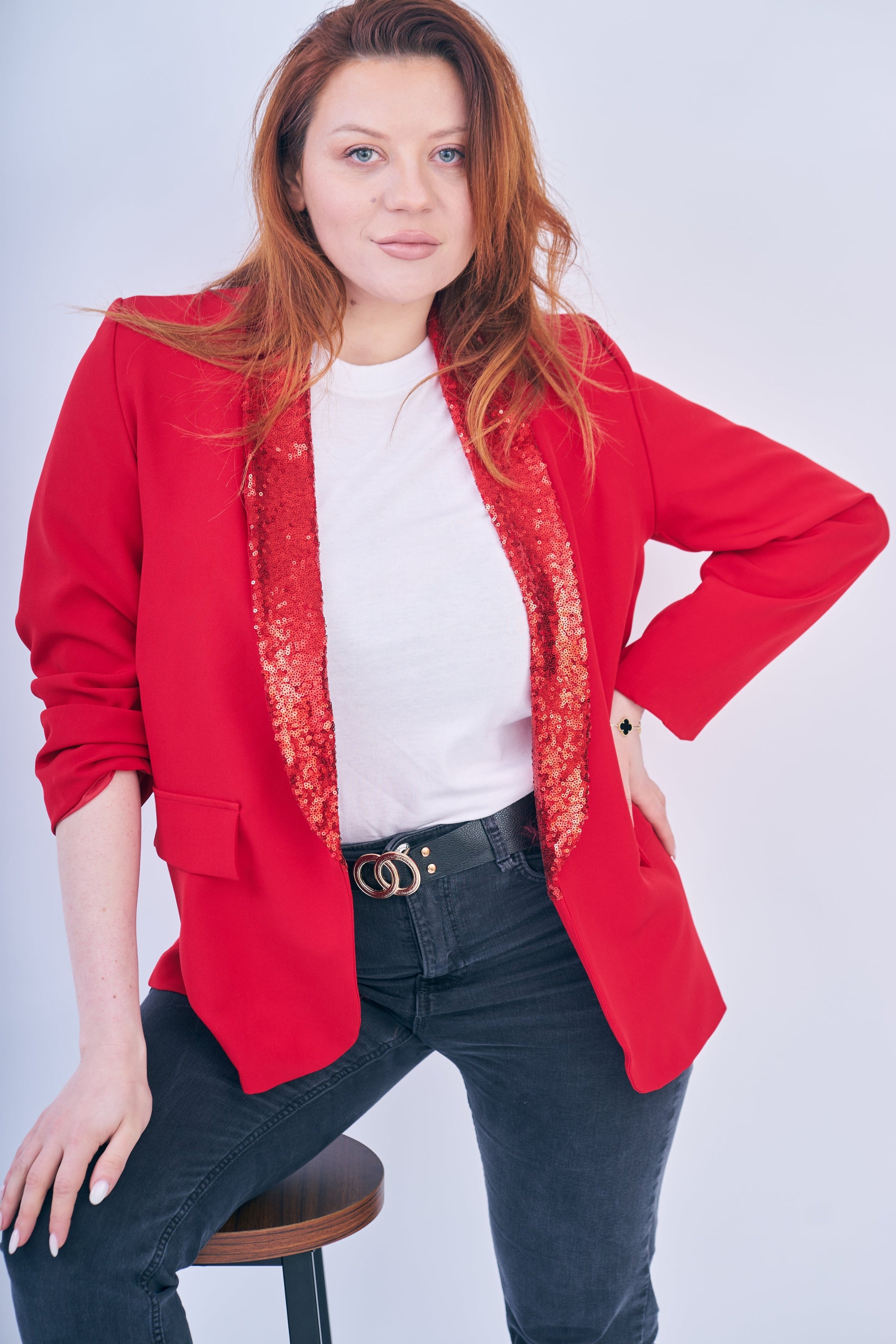 Red Sequin Lapel Blazer Bold, captivating, and dazzling introducing the must have Red Sequin Lapel Blazer . A true celebration of style, this blazer commands attention with its shimmering sequin lapel that exudes glamour. Perfectly tailored to accentuate your confidence, it features a chic open front design, structured silhouette, and full length sleeves. Whether you're stepping out for a night of festive fun or an elegant evening event, this statement piece is sure to elevate your look. Pair it with sleek tailored trousers or a pencil skirt for a showstopping ensemble.