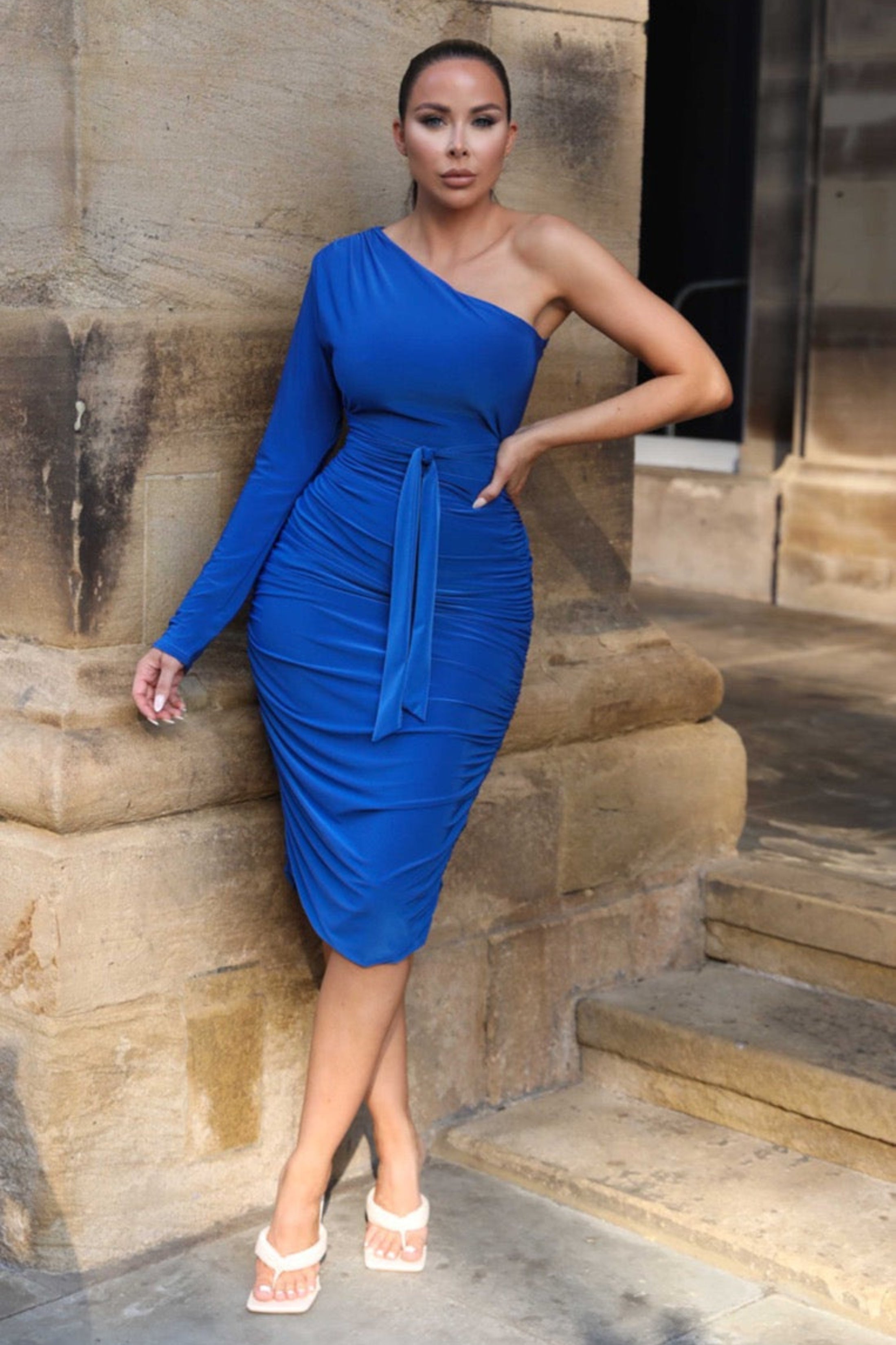 Royal Blue One Shoulder Ruched Slinky Midi Dress