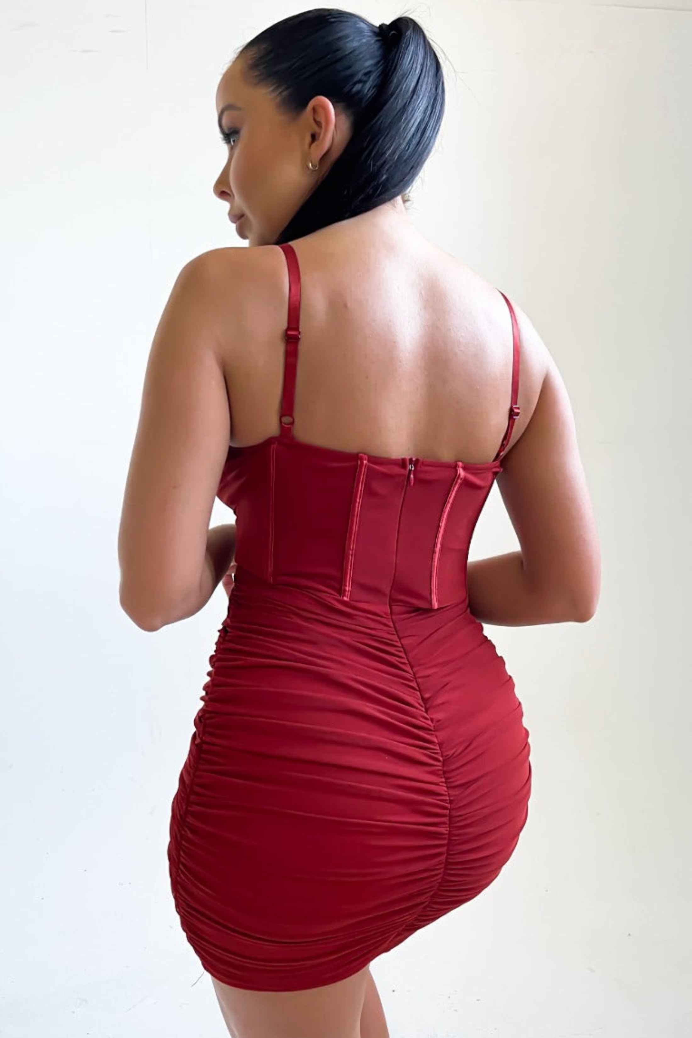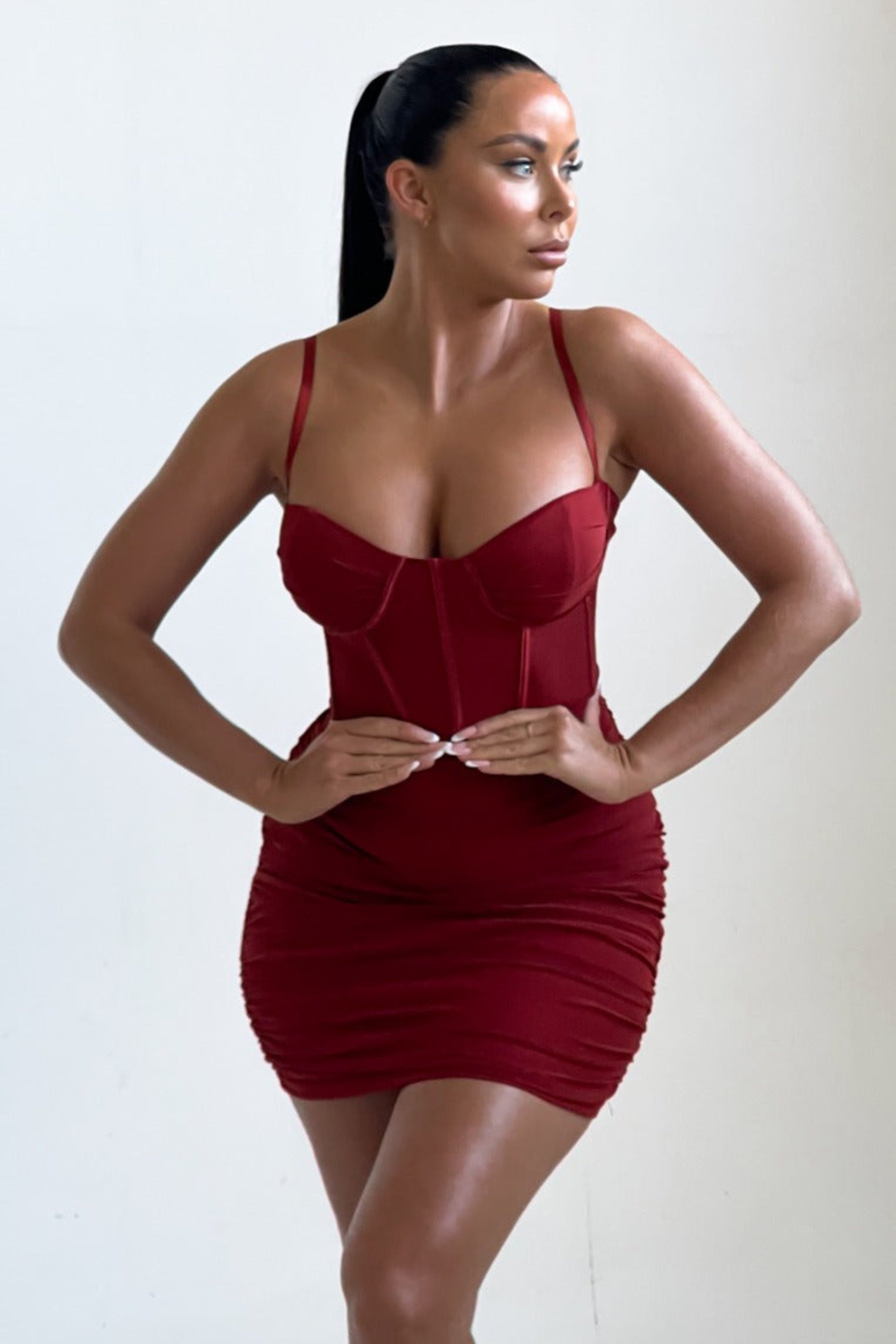 Rust Mesh Ruched Corset Strappy Bodycon Mini Dress - Penny