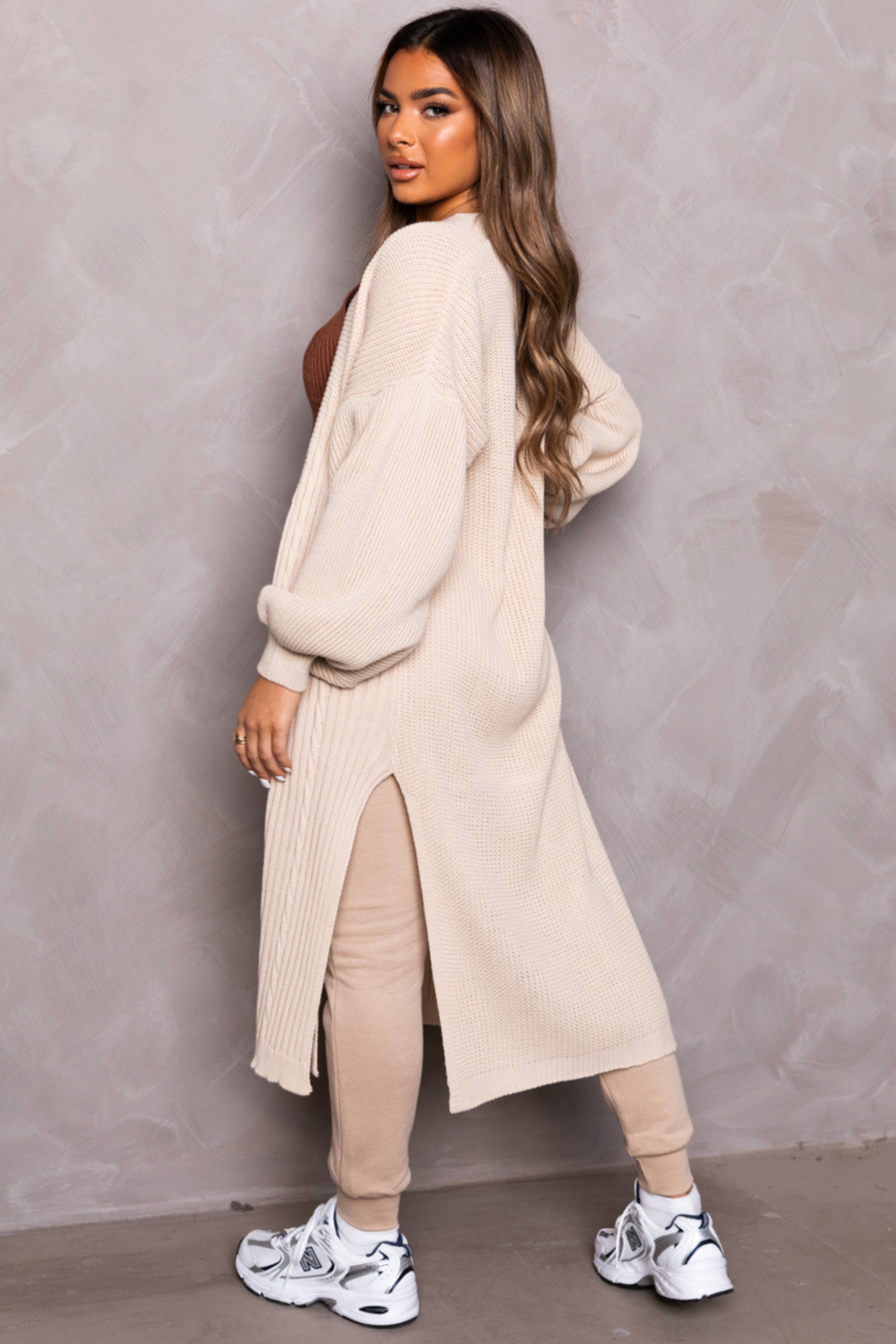 Dial-up the sass this season and up your off-duty slay in our Stone Knitted Balloon Sleeve Side Split Longline Midi Cardigan. Featuring balloon sleeves with a side split detailing in a midi length, this cardigan is in a cosy knitted material, keeping you warm yet stylish. Team with a pair of joggers and bodysuit with chunky trainers for casual look.