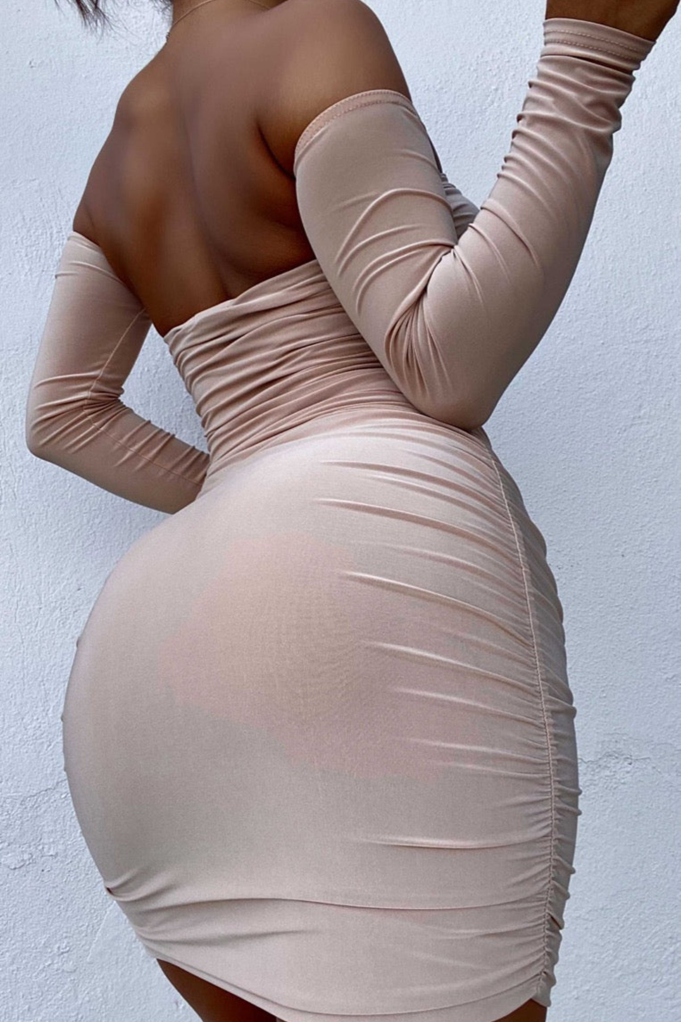 Stone Slinky Ruched Bardot Long Sleeve Cut Out Tie Front Bodycon Mini Dress