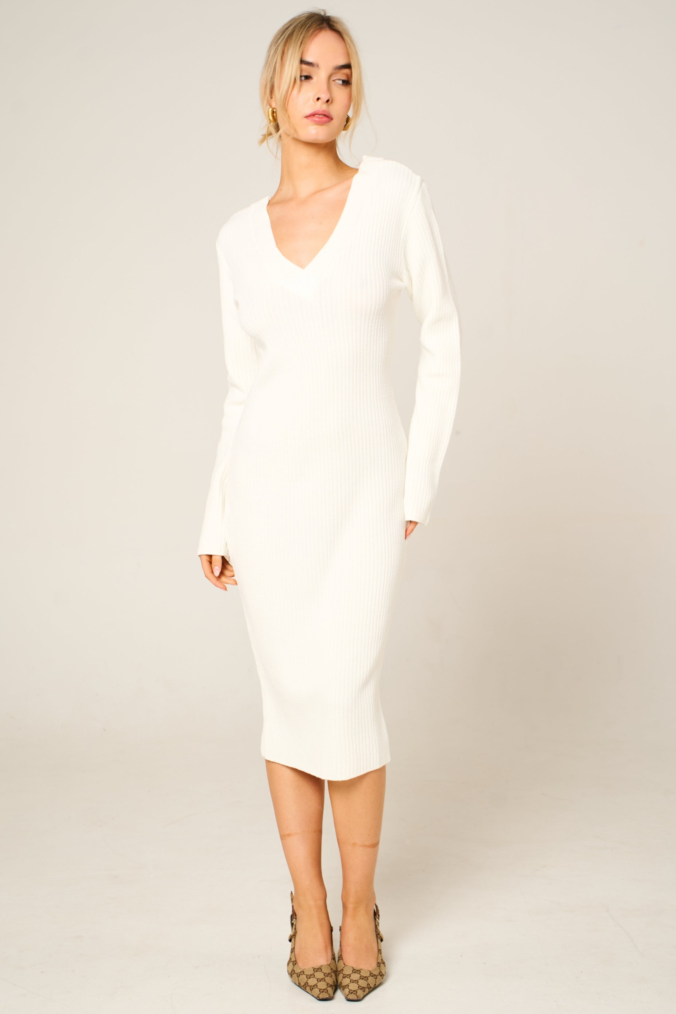 Cream Ribbed V Neck Midi Jumper Dress - Ivy