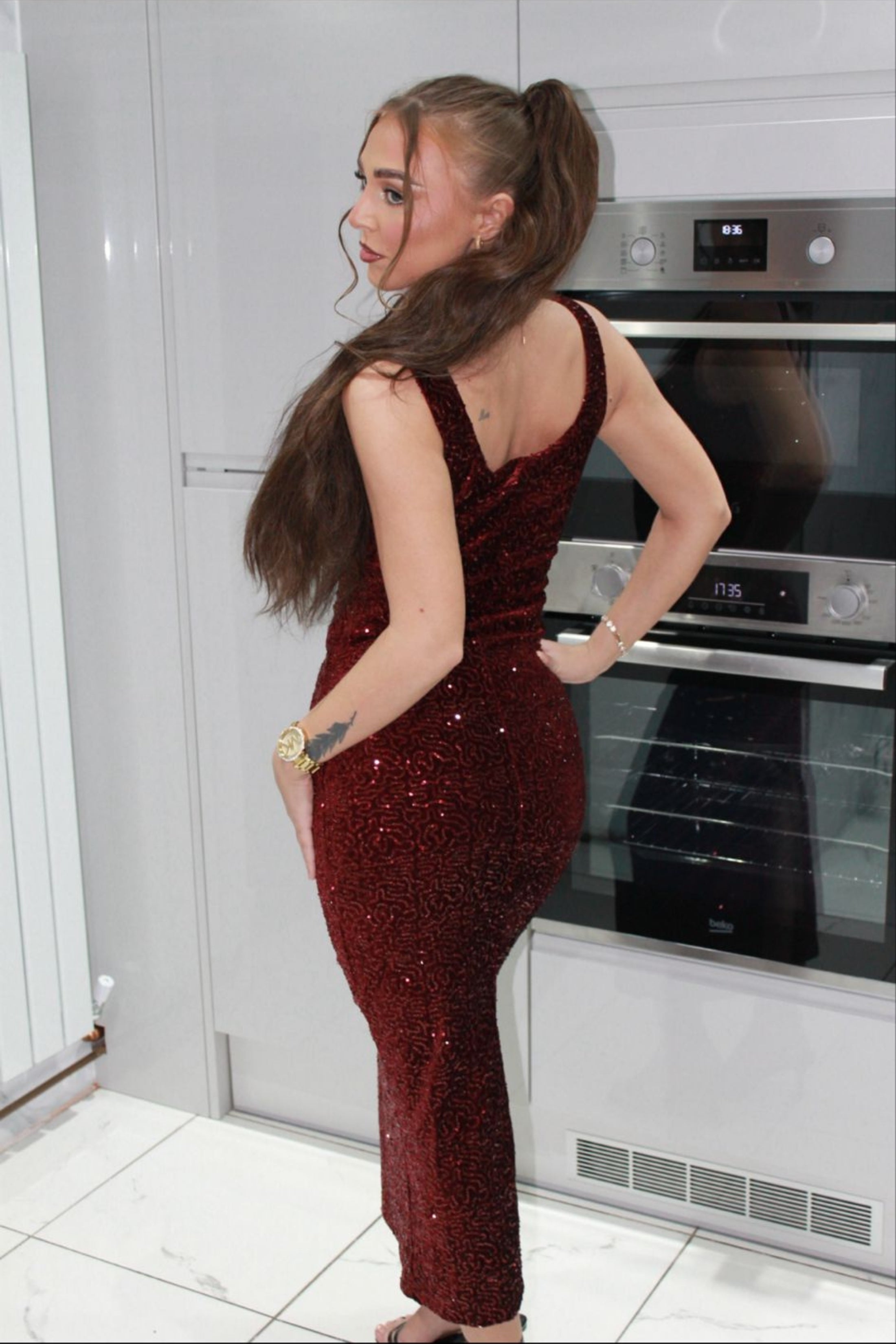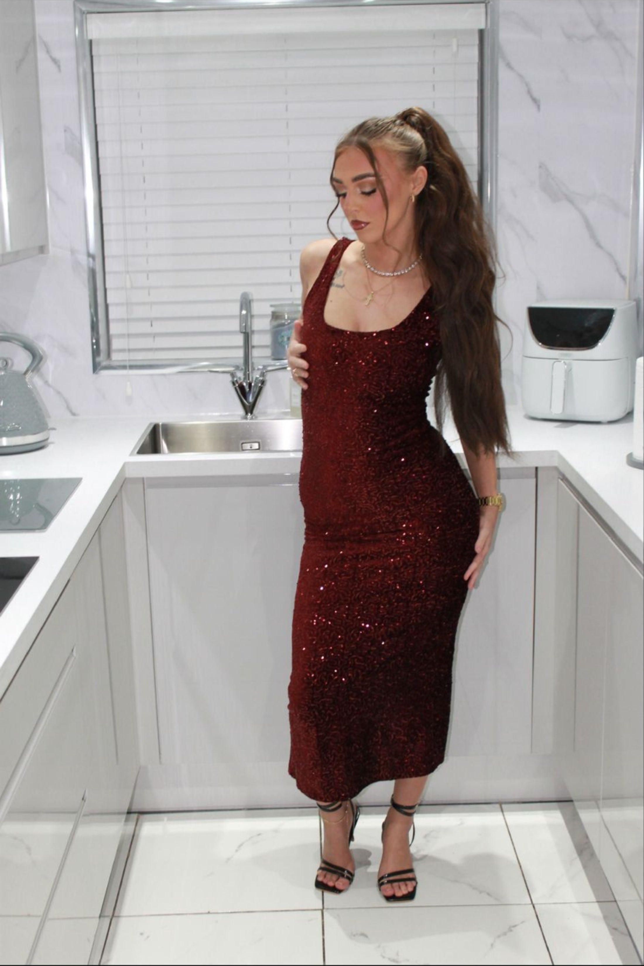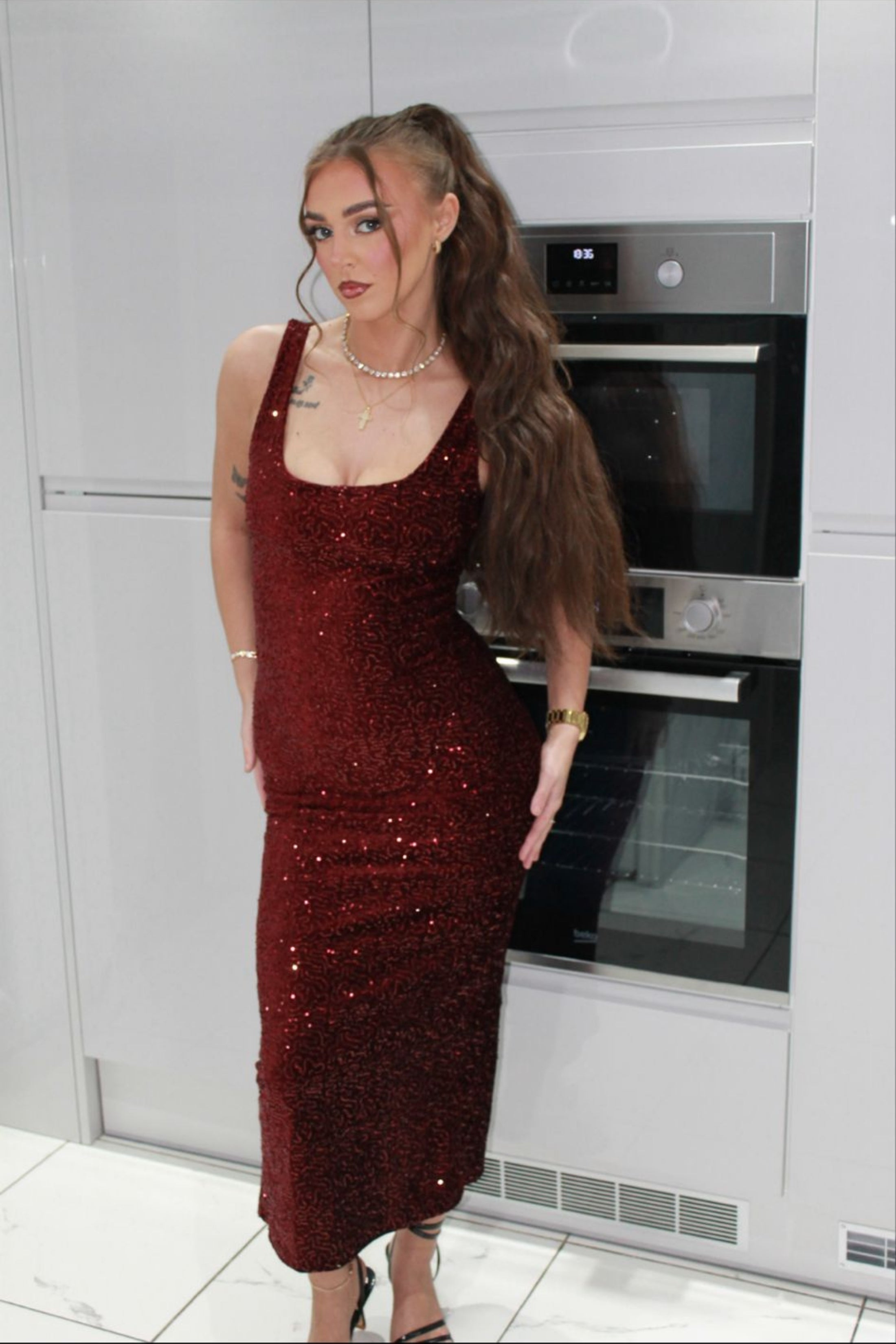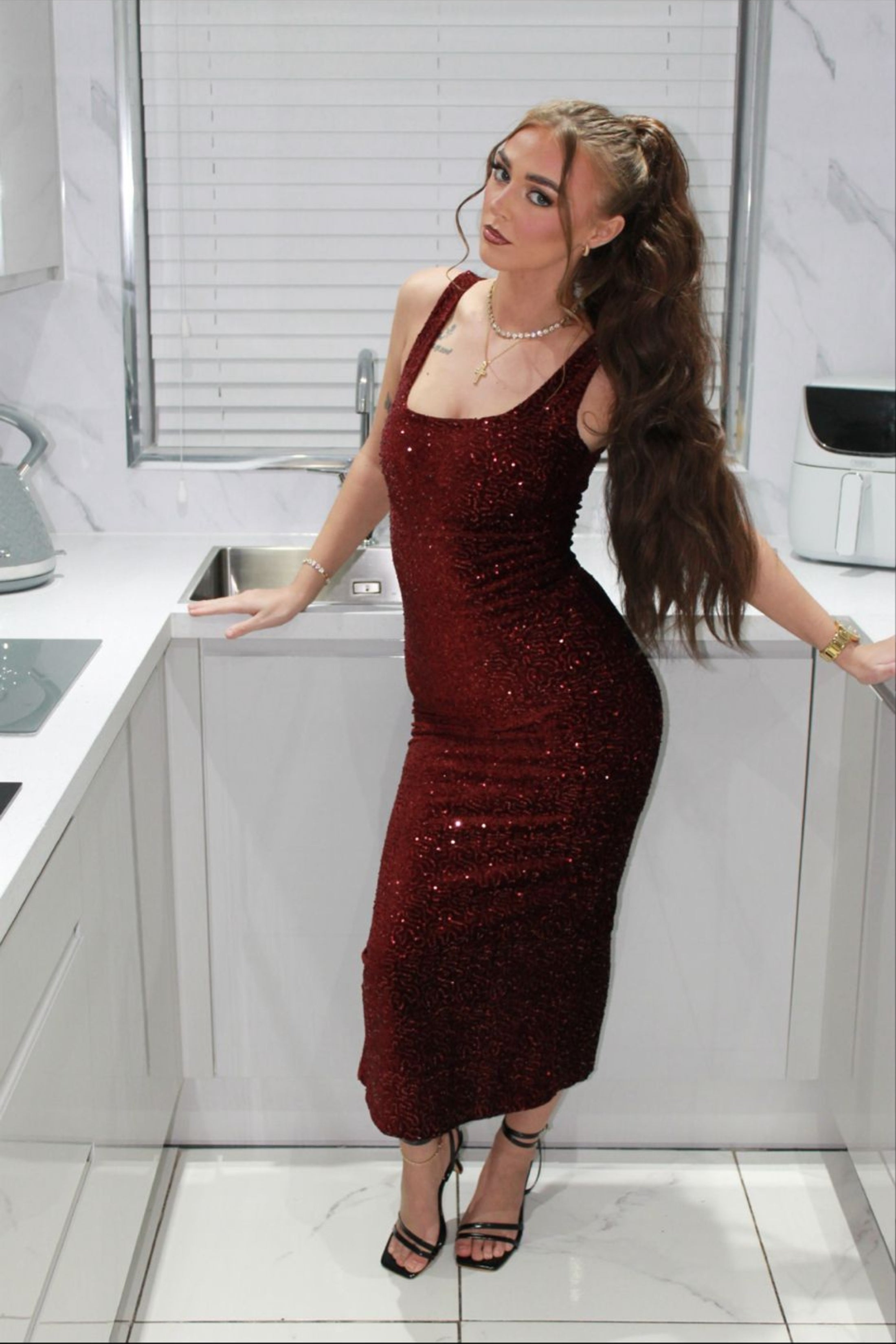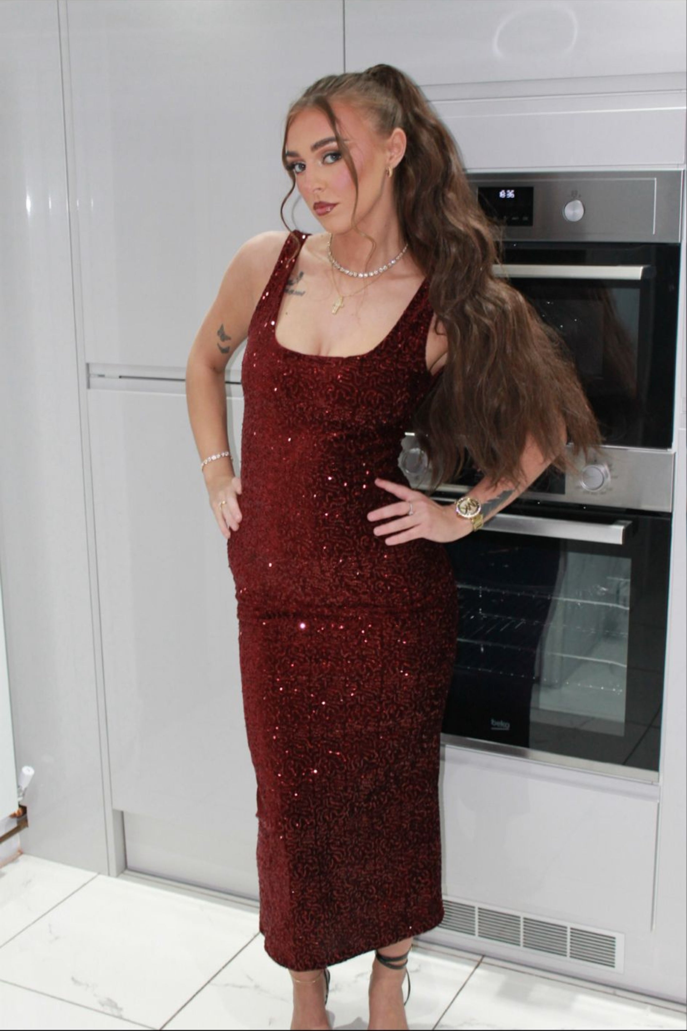 Bathed in the glow of candlelit evenings and shimmering allure, meet the breathtaking Wine Sequin Sleeveless Sparkly Bodycon Midi Dress . A piece that promises to steal every glance, it’s your go to for unforgettable nights. Designed to hug your curves in all the right places, this dazzling dress radiates confidence and sophistication with every move. Featuring a sleeveless cut, a figure flattering bodycon fit, and all over sequins that catch the light beautifully, it’s pure elegance with a touch of sparkle. Pair with statement heels and a sleek clutch for that ultimate after dark glamour.