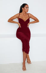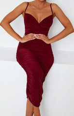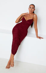 Wine Slinky Ruched Wrap Strappy Bodycon Midi Dress - Pia
